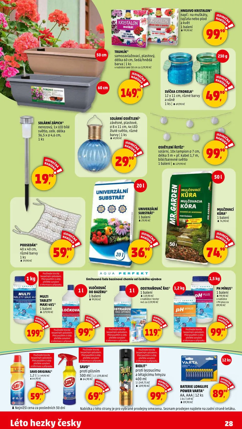 V letáku obchodu Penny Market najdete širokou nabídku produktů pro zahradu a domácnost. Mezi novinkami se objevují solární zápichy s LED osvětlením za 90 Kč a samozavlažovací truhlíky v šedé nebo hnědé barvě za 149 Kč. Dále nabízíme univerzální substrát za 29,90 Kč a hnojivo Kristalon za 99,90 Kč, ideální pro muškáty a rajčata.