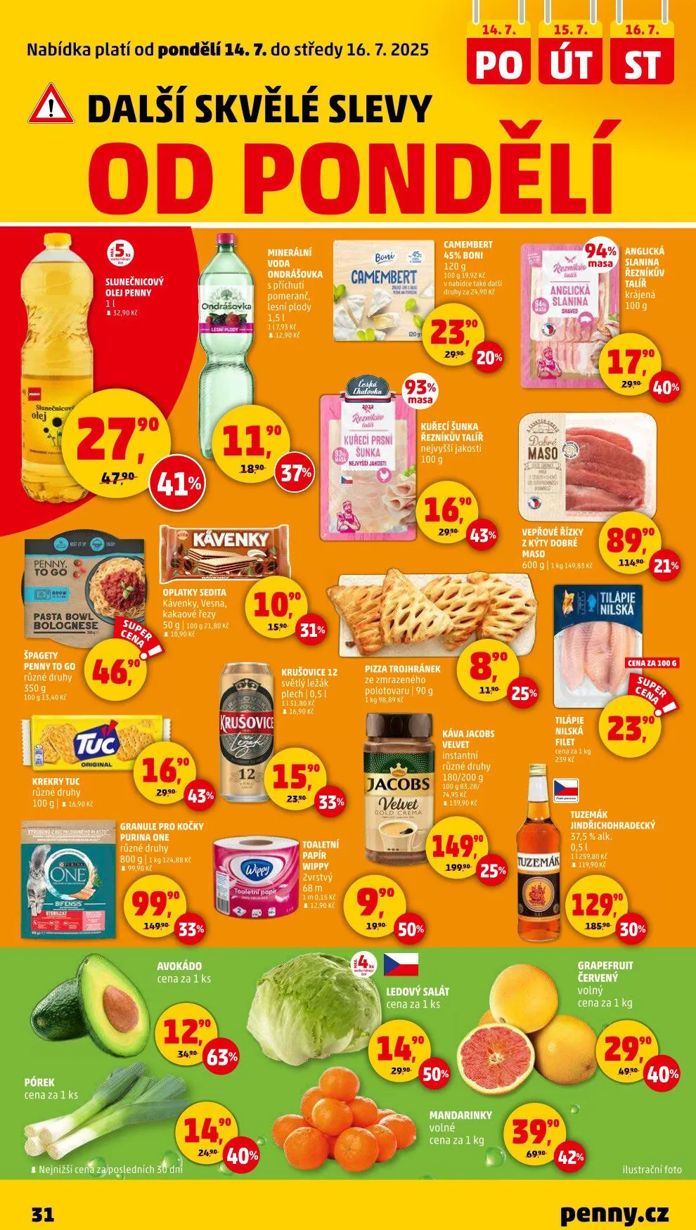 V letáku obchodu Penny Market najdete skvělé nabídky, které platí od pondělí 14.7. do středy 16.7.2025. Mezi produkty se objevuje anglická slanina, krájená 100 g, a slunečnicový olej Penny. Dále si můžete vybrat minerální vodu Ondrášouka s příchutí pomeranč a lesní plody.