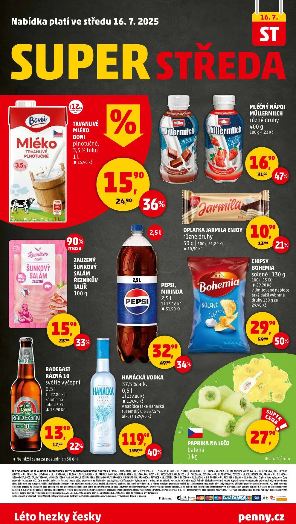V letáku obchodu Penny Market na středu 16.7.2025 najdete širokou nabídku produktů za skvělé ceny. Mezi nimi je trvanlivé plnotučné mléko Boni za 15,90 Kč a šunkový salám Řezníkův talíř za 33% slevu. Dále si můžete vychutnat Pepsi nebo Mirindu za 31,90 Kč.