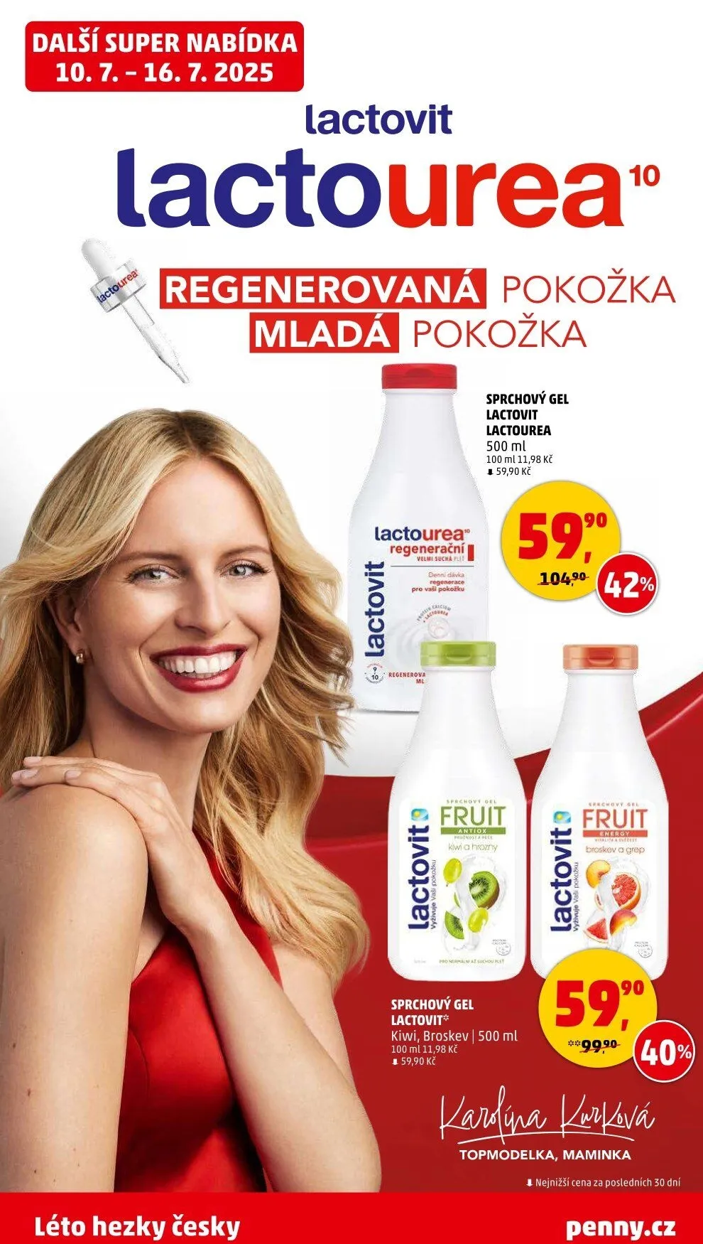 V letáku obchodu Penny Market na období od 10. 7. do 16. 7. 2025 najdete skvělé nabídky na produkty Lactovit. Nabízíme sprchový gel Lactovit s obsahem lactourey, který je ideální pro regeneraci pokožky. K dispozici je v balení 500 ml za cenu 59,90 Kč, přičemž cena za 100 ml činí 11,98 Kč.