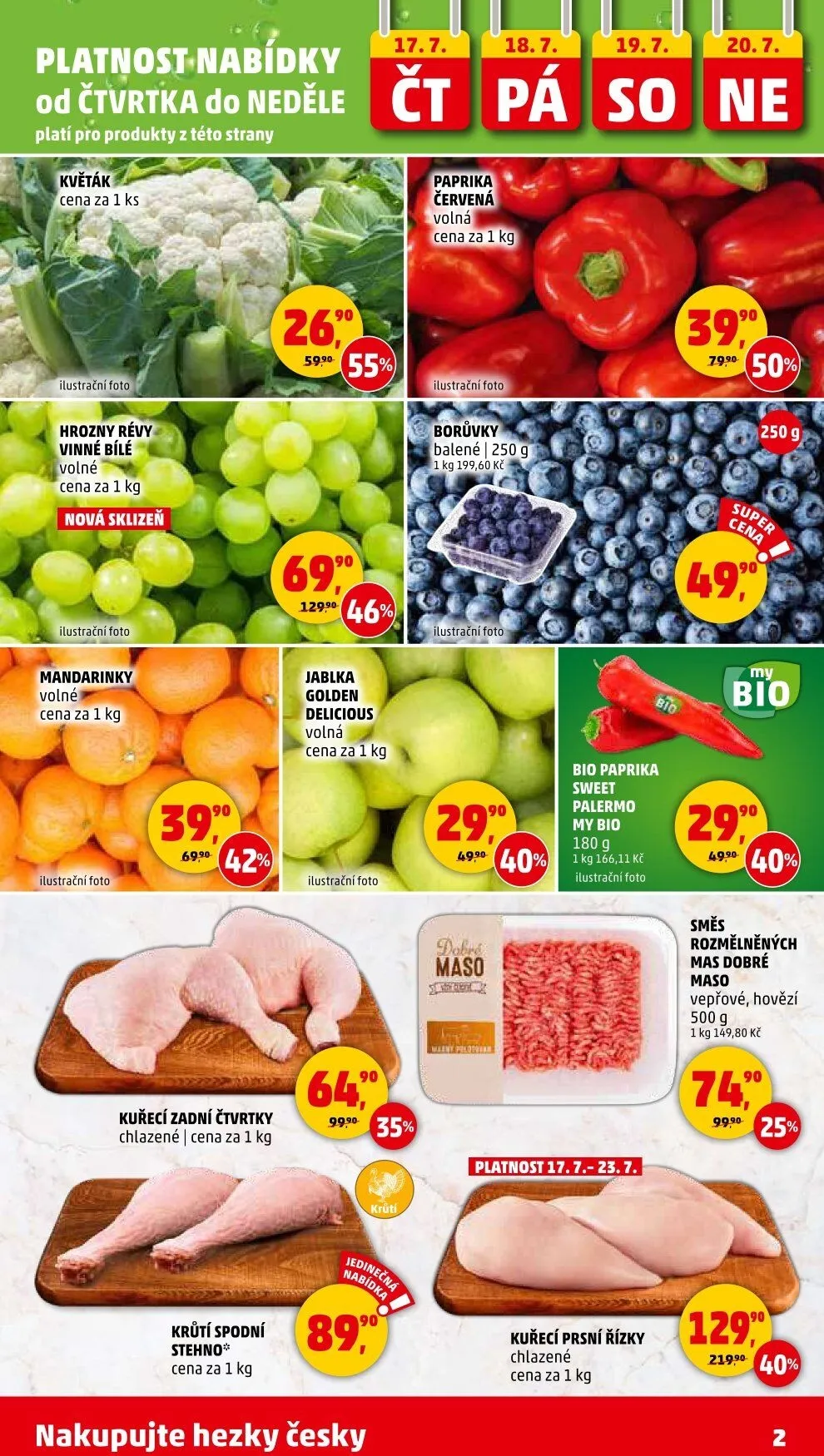 Také si můžete vybrat bio papriku Sweet Palermo a směs rozmělněného masa z vepřového a hovězího. Nezapomeňte na kuřecí prsní řízky, které jsou také v akci. Všechny ceny jsou uvedeny za 1 kg. Nakupujte hezky česky!