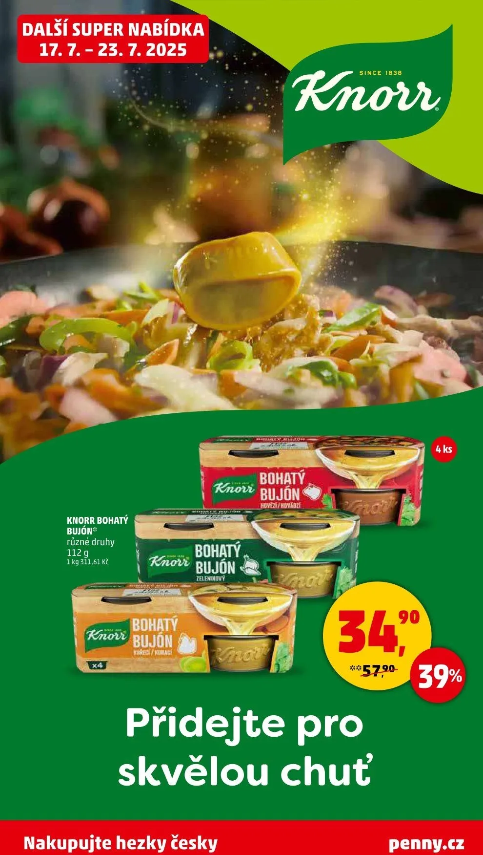 V letáku obchodu Penny Market na období od 17. 7. do 23. 7. 2025 najdete skvělou nabídku na bohatý bujón Knorr. Tento produkt je dostupný v různých druzích a balení o hmotnosti 112 g. Cena za 1 kg je 311,61 Kč. Přidejte bohatý bujón do svých pokrmů a vychutnejte si skvělou chuť. Nakupujte hezky česky na penny.cz!