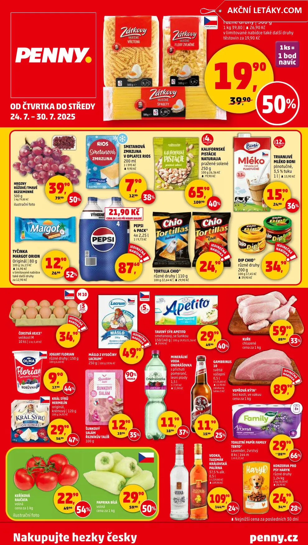 V letáku obchodu Penny Market najdete širokou nabídku produktů za skvělé ceny. Mezi nimi jsou zátkové vaječné těstoviny různých druhů za 26,90 Kč za 500 g, a v limitované nabídce také další druhy těstovin za 19,90 Kč. Nezapomeňte na smetanovou zmrzlinu Rios v balení 200 ml a trvanlivé mléko Bon s 1 bodem navíc.