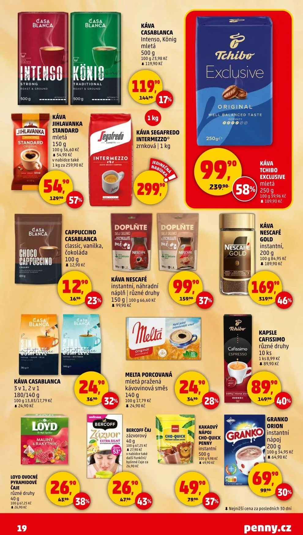 V letáku obchodu Penny Market najdete širokou nabídku káv a nápojů. Mezi oblíbené produkty patří mletá káva Jihlavanka Standard 500 g za 119,90 Kč a zrnková káva Segafredo Intermezzo 1 kg za 259,90 Kč. Pro milovníky instantní kávy je k dispozici Nescafé Gold 200 g za 189,90 Kč a Tchibo Exclusive 250 g za 99,90 Kč.