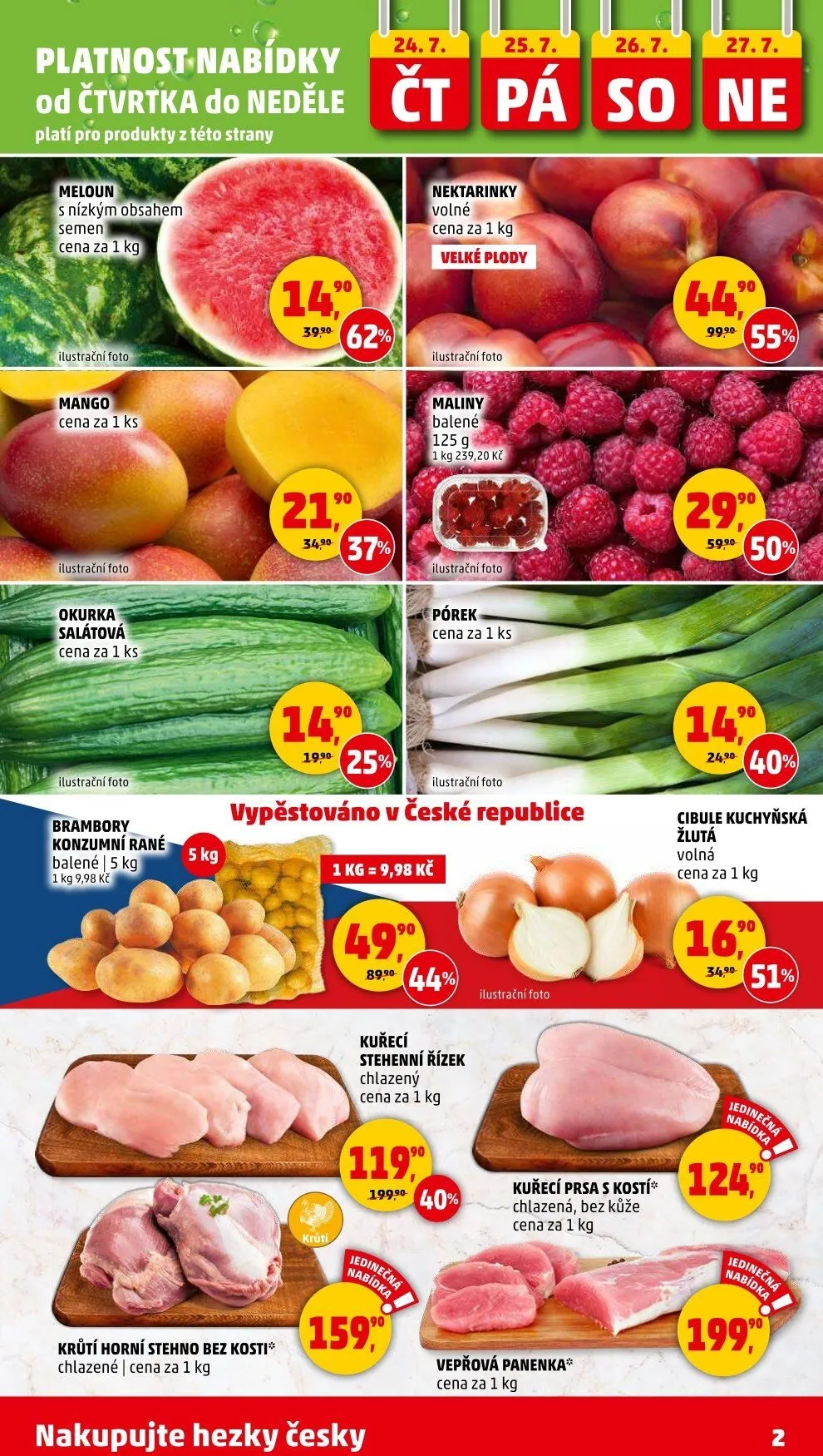V nabídce jsou také konzumní rané brambory balené po 15 kg, které stojí 9,98 Kč za 1 kg. Nezapomeňte na nektarinky za 90 Kč za 1 kg a maliny balené po 125 g za 239,20 Kč za 1 kg.