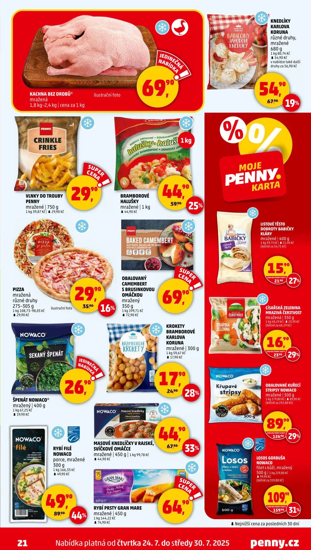 V letáku obchodu Penny Market najdete širokou nabídku mražených produktů. Mezi nimi se objevují kachny bez orobů, mražené crinkle fries a bramborové halušky. Dále si můžete vybrat z obalovaného camembertu s brusinkovou omáčkou nebo různých druhů mražených knedlíků.