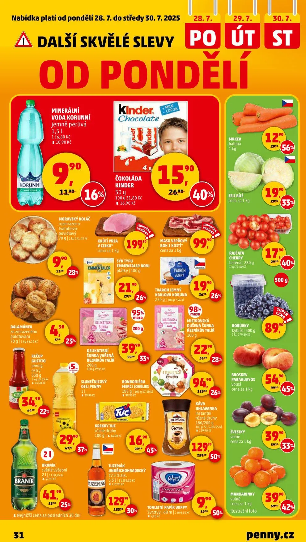 V letáku obchodu Penny Market najdete skvělé nabídky platné od pondělí 28.7. do středy 30.7.2025. Mezi lákavé produkty patří jemný a ostrý kečup Gustito za 10,90 Kč, minerální voda Korunní jemně perlivá za 11 Kč a moravský koláč tvarohovo-povidlový za 16,90 Kč.