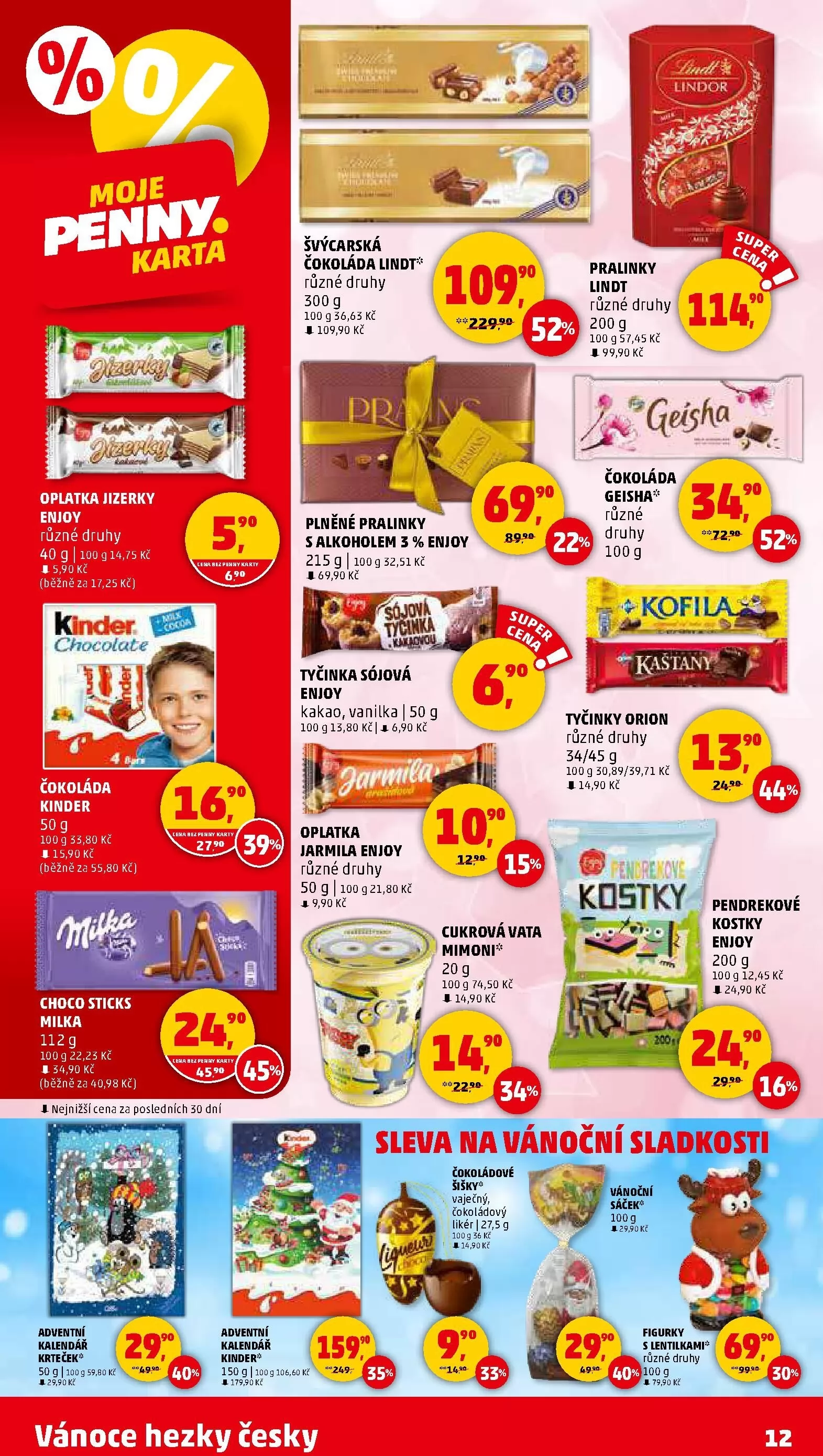 V letáku obchodu Penny Market najdete širokou nabídku sladkostí a čokoládových produktů. Mezi nimi se objevují oblíbené značky jako Lindor a Kinder. Například švýcarská čokoláda Lindt v různých druzích je k dostání za 109,90 Kč za 300 g, zatímco plněné pralinky s alkoholem Enjoy můžete pořídit za 69,90 Kč za 215 g.