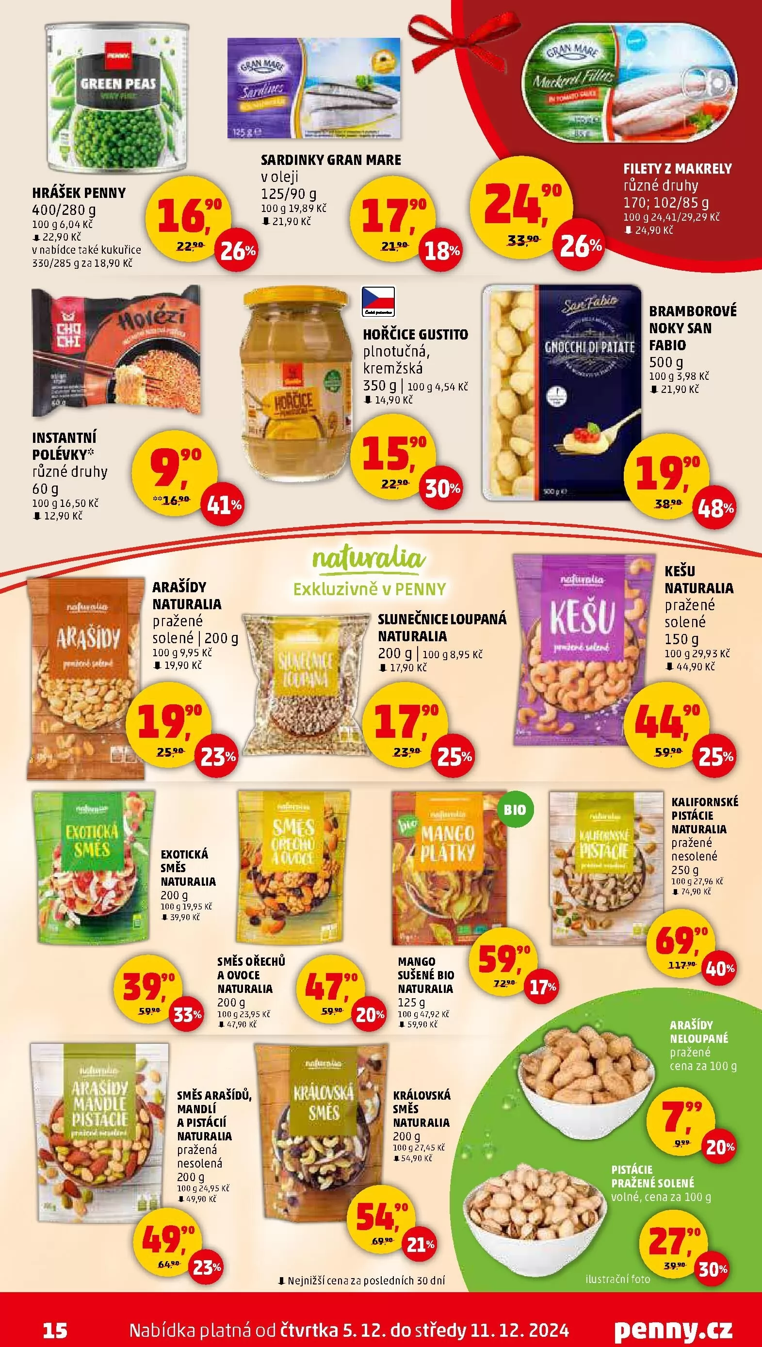 Dalšími lákadly jsou sardinky Gran Mare (125/90 g) za 21,90 Kč, instantní polévky různých druhů za 12,90 Kč a pražené solené arašídy Naturalia (200 g) za 19,90 Kč.