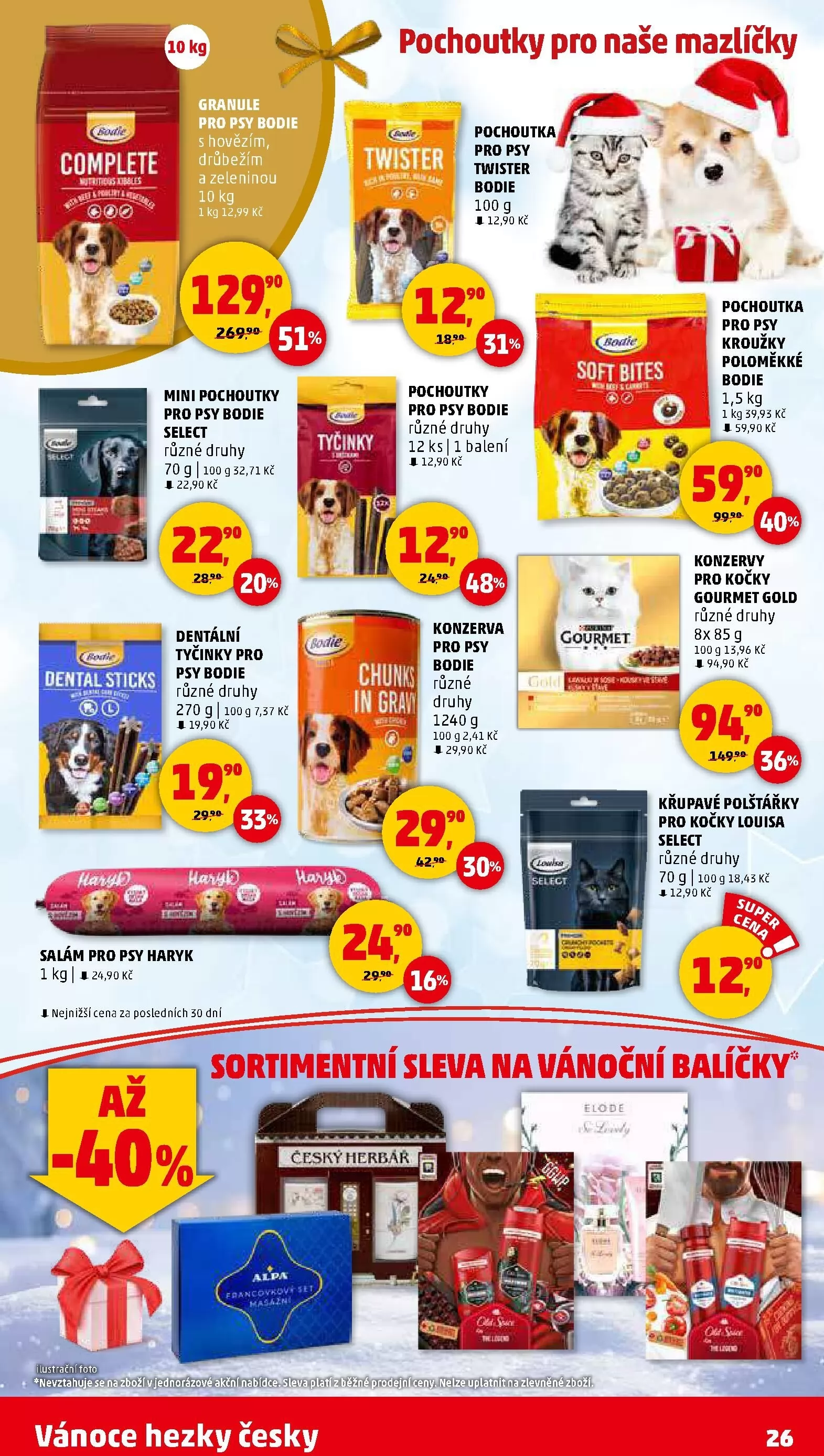 Mezi nimi jsou granule pro psy Bodie s hovězím, drůbežím a zeleninou v balení 10 kg za 12,99 Kč za 1 kg.