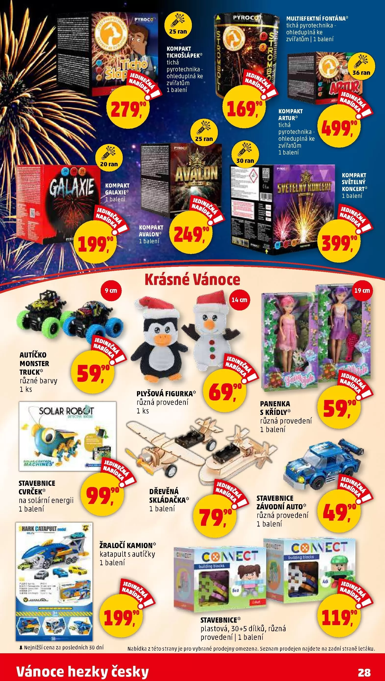 V letáku obchodu Penny Market najdete širokou nabídku zajímavých produktů pro nadcházející svátky. Mezi nimi jsou pyrotechnické výrobky, jako jsou tichá ohleduplná fontána a multiefektní pyrotechnika, které potěší nejen dospělé, ale i děti. Dále si můžete vybrat z různých stavebnic, jako je solární robot nebo závodní auto, které rozvíjejí kreativitu a zručnost.
