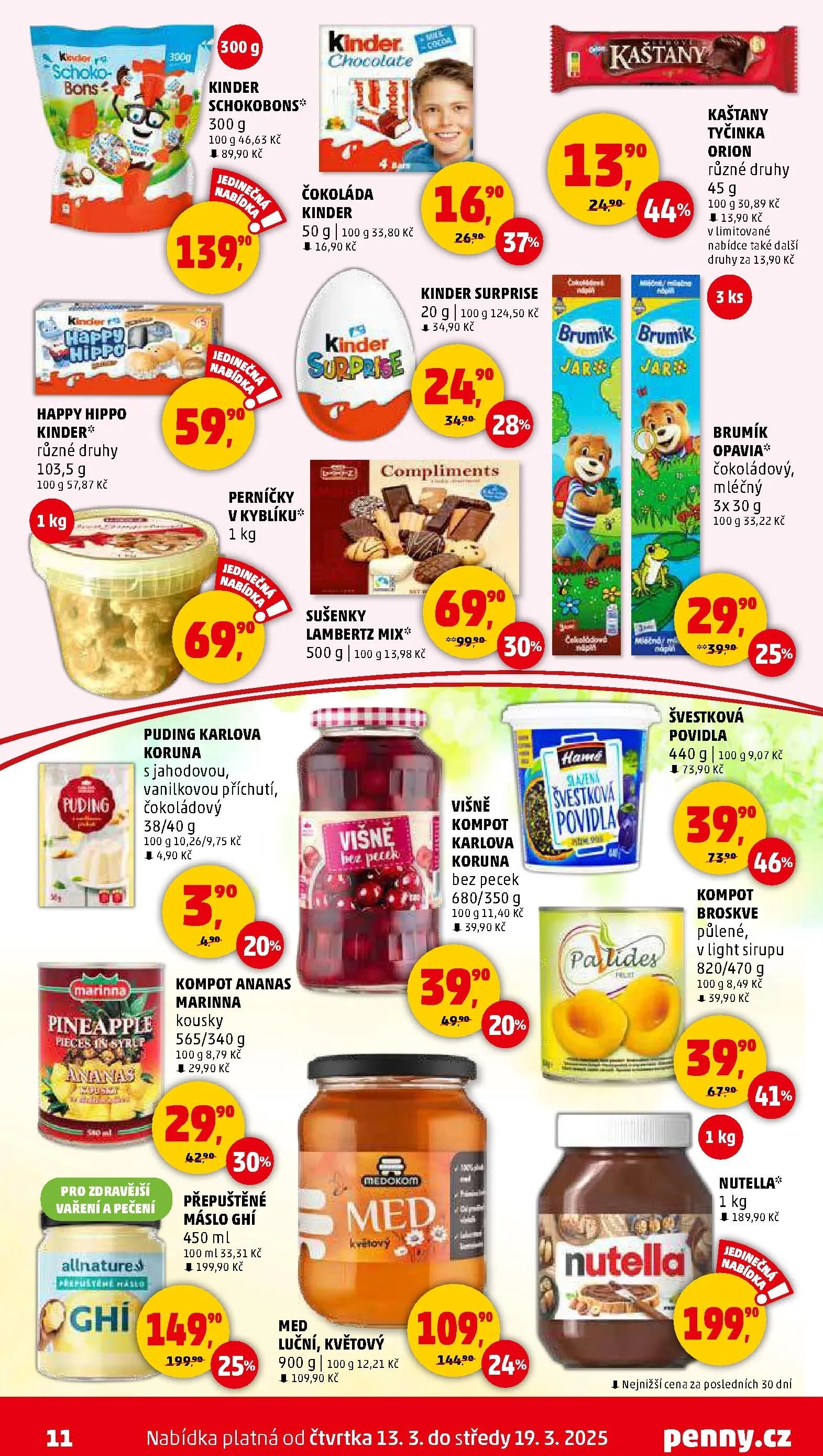 V letáku obchodu Penny Market najdete širokou nabídku sladkostí a pochutin. Mezi nimi jsou oblíbené Kinder produkty, jako jsou Kinder čokoláda, Kinder Schokobons a Kinder Surprise. Dále si můžete vybrat z perníčků v kyblíku, pudingu Karlova koruna s jahodovou a vanilkovou příchutí, nebo sušenek Lambertz mix.