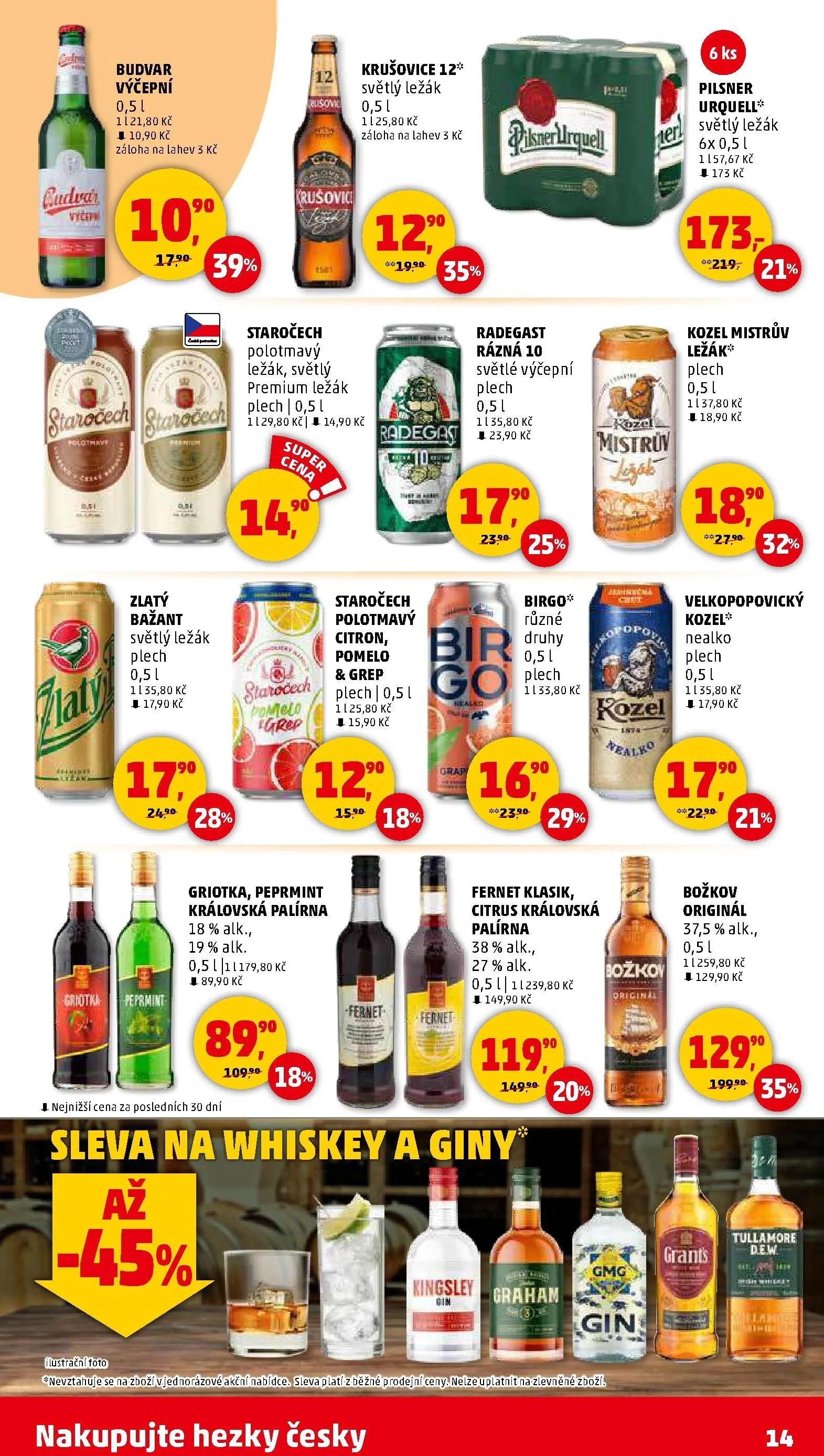 Mezi lihovinami najdete Fernet klasik a další varianty od Královské palírny, které začínají na ceně 89,90 Kč. Nezapomeňte také na Pilsner Urquell světlý ležák za 157,67 Kč. Pro nealkoholické nápoje je tu Velkopopovický Kozel za 155,80 Kč.