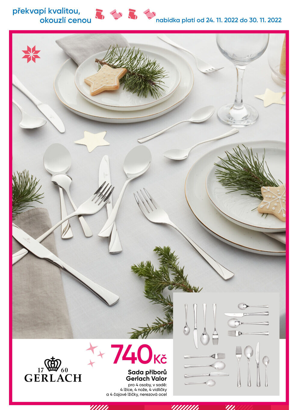 překvapí kvalitou, okouzlí cenou 60 17 gerlach nabídka platí od 24. 11.2022 do 30. 11. 2022 740kč sada příborů gerlach valor pro 4 osoby, v sadě: 4 lžíce, 4 nože, 4 vidličky a 4 čajové lžičky, nerezová ocel