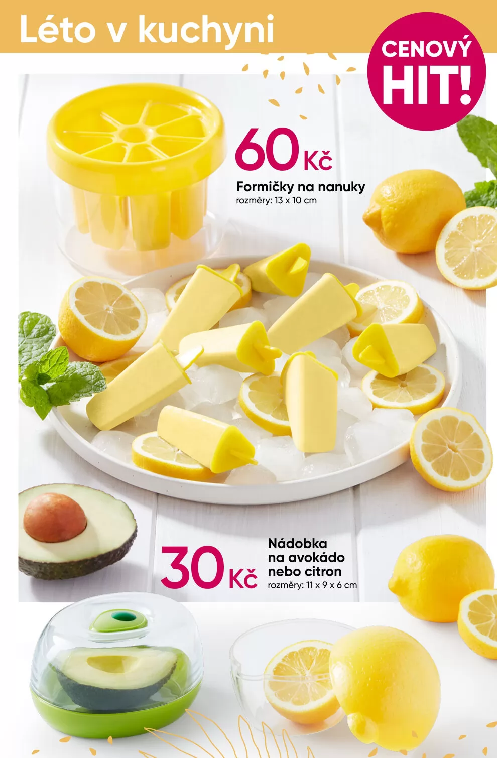 léto v kuchyni 60kč formičky na nanuky rozměry: 13 x 10 cm nádobka 30kč na avokádo nebo citron rozměry: 11 x 9 x 6 cm cenový hit!