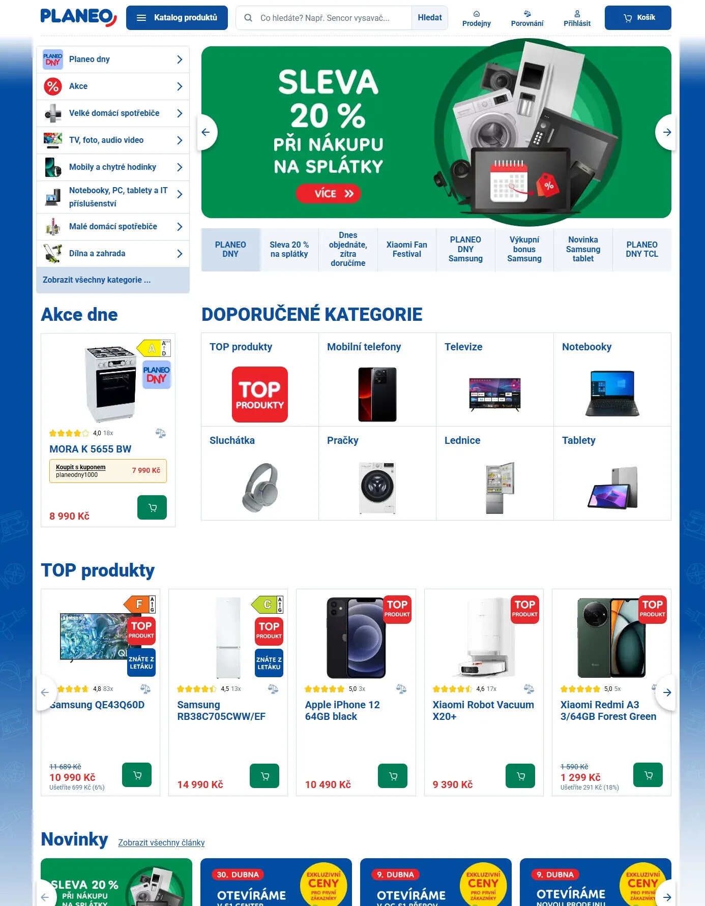 V letáku obchodu Planeo Elektro najdete širokou nabídku produktů za skvělé ceny. Mezi top produkty patří například Samsung QE43Q60D za 10 990 Kč, kde ušetříte 699 Kč. Dále nabízíme Mora K 5655 BW za 7 990 Kč a Samsung RB38C705CWW/EF za 14 990 Kč. Nezapomeňte také na Xiaomi Robot Vacuum za 9 390 Kč a Apple iPhone 12 (64GB) za 10 490 Kč. V rámci Planeo Dnů můžete využít slevy až 20 % na vybrané produkty a objednávky doručujeme již následující den. Prozkoumejte také novinky a akce na malé i velké domácí spotřebiče, mobily, notebooky a další elektroniku.