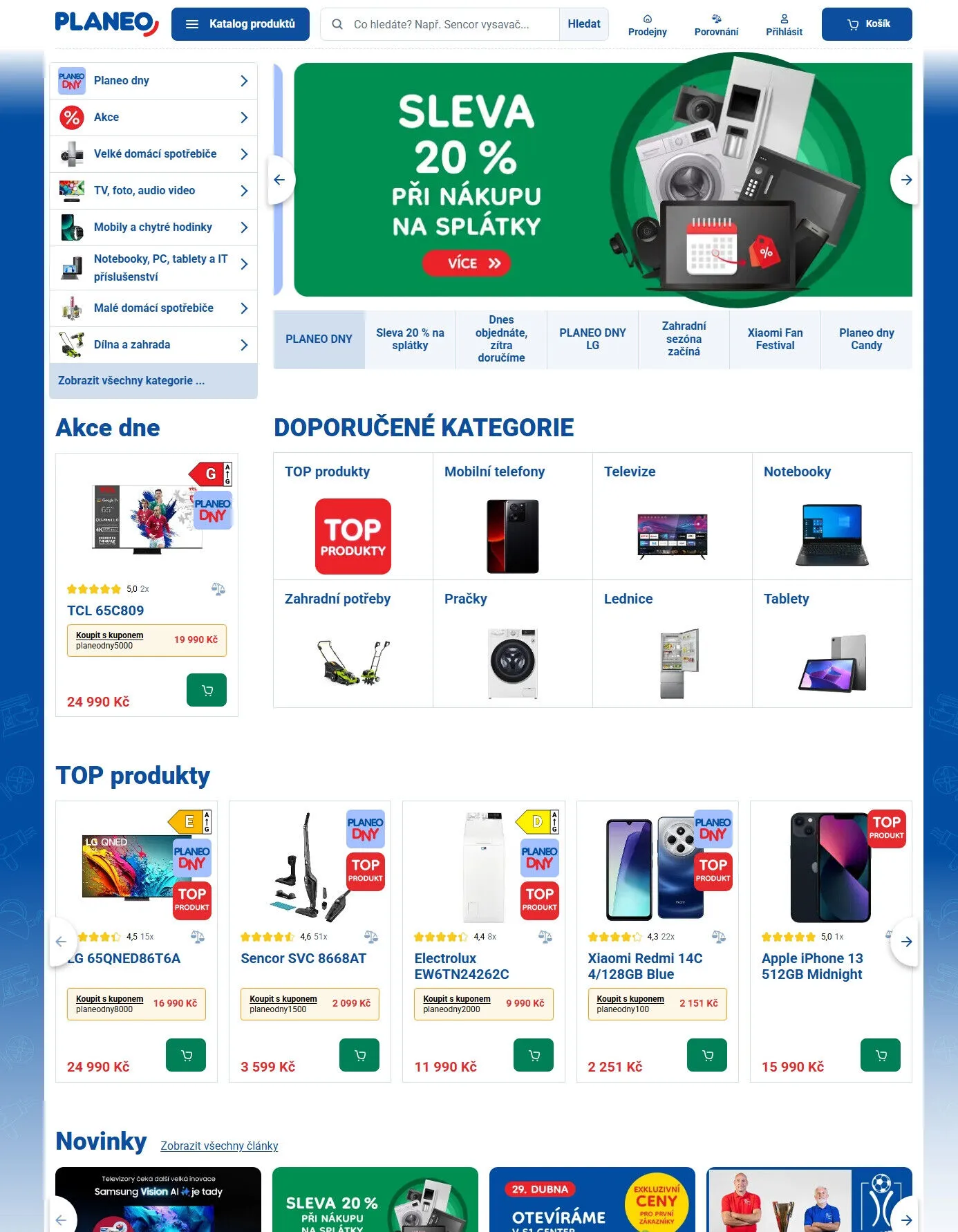 V letáku obchodu Planeo Elektro najdete širokou nabídku produktů za skvělé ceny. Aktuálně probíhá akce Planeo dny, kde můžete využít slevy až 20 % na vybrané zboží. Mezi top produkty patří vysavač Sencor SVC 8668AT za 2 099 Kč a televizor TCL 65C809, který nyní pořídíte za 19 990 Kč.