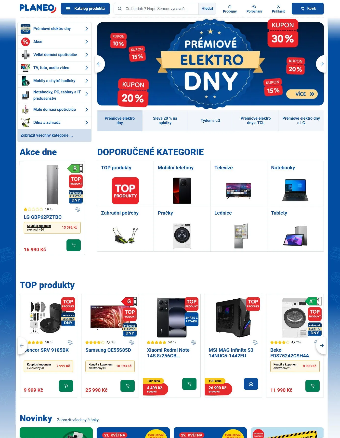 V letáku obchodu Planeo Elektro najdete širokou nabídku produktů v rámci prémiových elektro dnů. Můžete si vybrat z velkých domácích spotřebičů, jako jsou pračky a lednice, nebo z kategorie TV, foto a audio video. Pro milovníky technologií jsou k dispozici mobily, chytré hodinky, notebooky, PC a tablety. Nezapomněli jsme ani na příslušenství a malé domácí spotřebiče.
