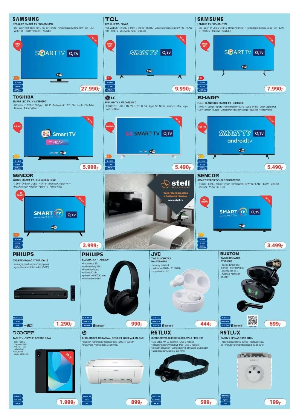 V letáku obchodu Planeo najdete širokou nabídku elektroniky a domácích spotřebičů. Mezi televizory se objevují modely jako Samsung Neo QLED Smart TV a Toshiba Smart LED TV. Pro milovníky menších obrazovek je k dispozici Sencor Smart TV a TCL Full HD TV.
