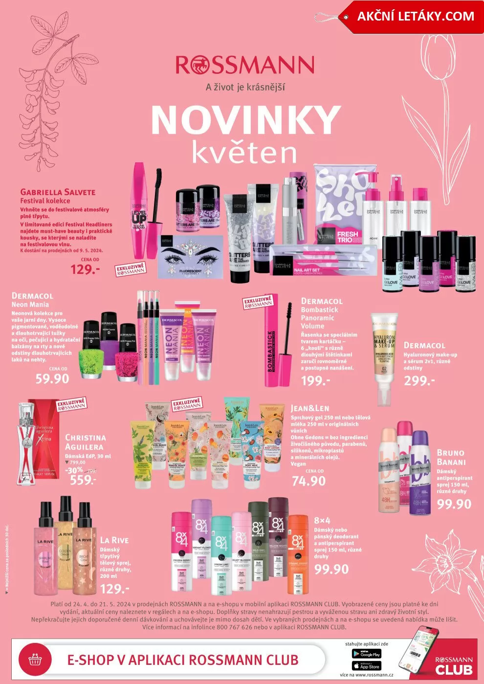 plati od 24.4. do 21. 5. 2024 v prodeinách rossmann a na e-shopu v mobilni aplikaci rossmann club- vyobrazené ceny jsou platně ke dni