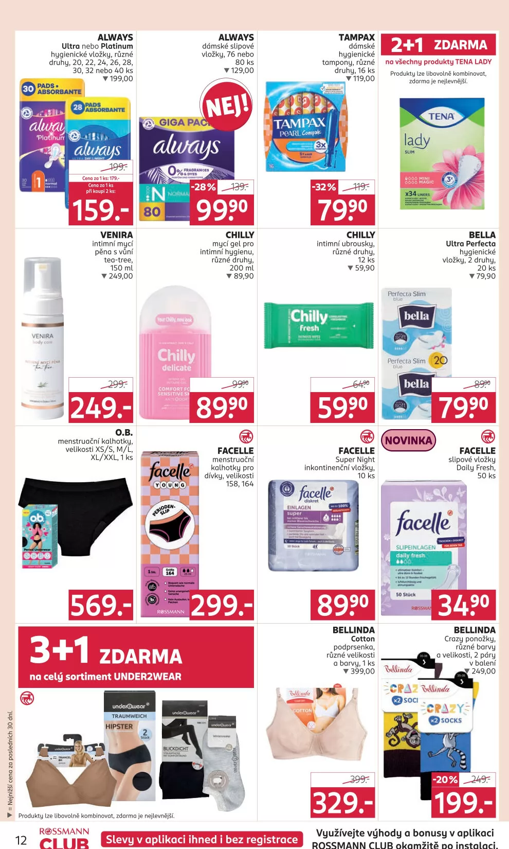 V letáku obchodu ROSSMANN drogerie najdete širokou nabídku hygienických produktů. Mezi nimi jsou hygienické vložky Always v různých variantách, balení od 20 do 40 ks za cenu 199,00 Kč. Dále nabízíme dámské slipové vložky Venira, které jsou k dispozici v balení po 76 nebo 80 ks za 129,00 Kč.
