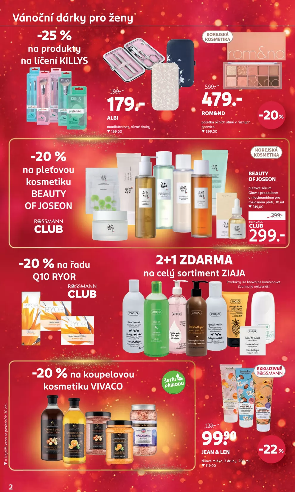 V letáku obchodu ROSSMANN drogerie najdete skvělé vánoční dárky pro ženy se slevami až -25 % na produkty líčení značky Killys. Na pleťovou kosmetiku Beauty of Joseon a řadu Q o Ryor platí sleva -20 %. Mezi nabídkou se objevuje také manikúrní set Albi za 179 Kč a paletka očních stínů rom&nd za 479 Kč. Nezapomeňte na pleťové sérum Glow s propolisem a niacinamidem, které je nyní za 319 Kč. V rámci akce 2+1 zdarma můžete kombinovat produkty Ziaja. Dále je k dispozici koupelová kosmetika Vivaco se slevou -20 % a tělové mléko Jean & Len za 119 Kč. Navštivte ROSSMANN a objevte širokou nabídku kosmetiky za skvělé ceny!