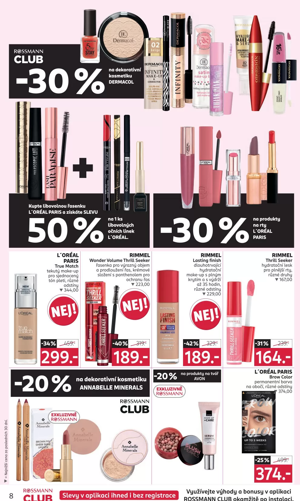 V letáku obchodu ROSSMANN drogerie najdete širokou nabídku dekorativní kosmetiky, která potěší každého milovníka krásy. Mezi hlavními produkty se objevují řasenky značky L'Oréal Paris a Rimmel, které nabízejí výrazný objem a prodloužení řas. Například Rimmel Wonder Volume Thrill Seeker řasenka je k dostání za 223 Kč, nyní za 189 Kč.