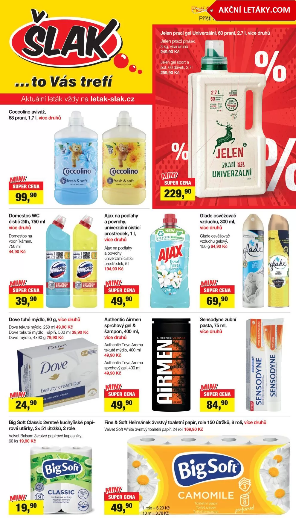 V letáku obchodu Šlak drogerie najdete širokou nabídku produktů, které potěší každého zákazníka. Mezi hlavními položkami se objevují prací prostředky značky Jelen, jako je univerzální prací gel (60 praní, 2,7 l) a prášek (3 kg) za cenu 249,90 Kč. Dále je k dispozici Jelen gel sapon a pot (60 dávek, 2,7 l) za 259,90 Kč.