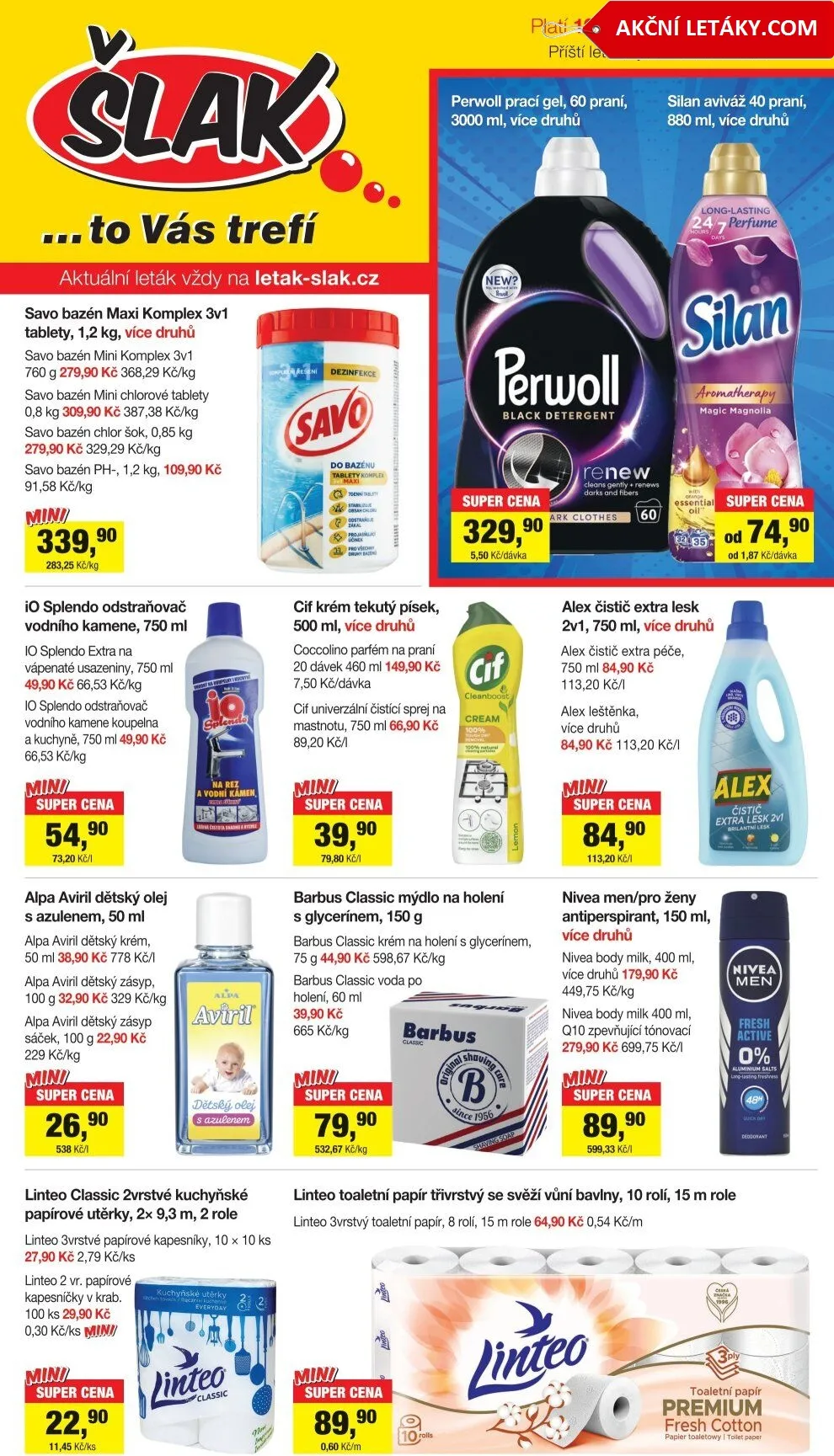 V letáku obchodu Šlak drogerie najdete širokou nabídku produktů, které vám usnadní údržbu domácnosti a péči o sebe. Mezi hlavními položkami se objevují produkty Savo pro údržbu bazénů, jako jsou chlorové tablety a pH regulátory. Dále nabízíme prací gely Perwoll a aviváže Silan v různých variantách.