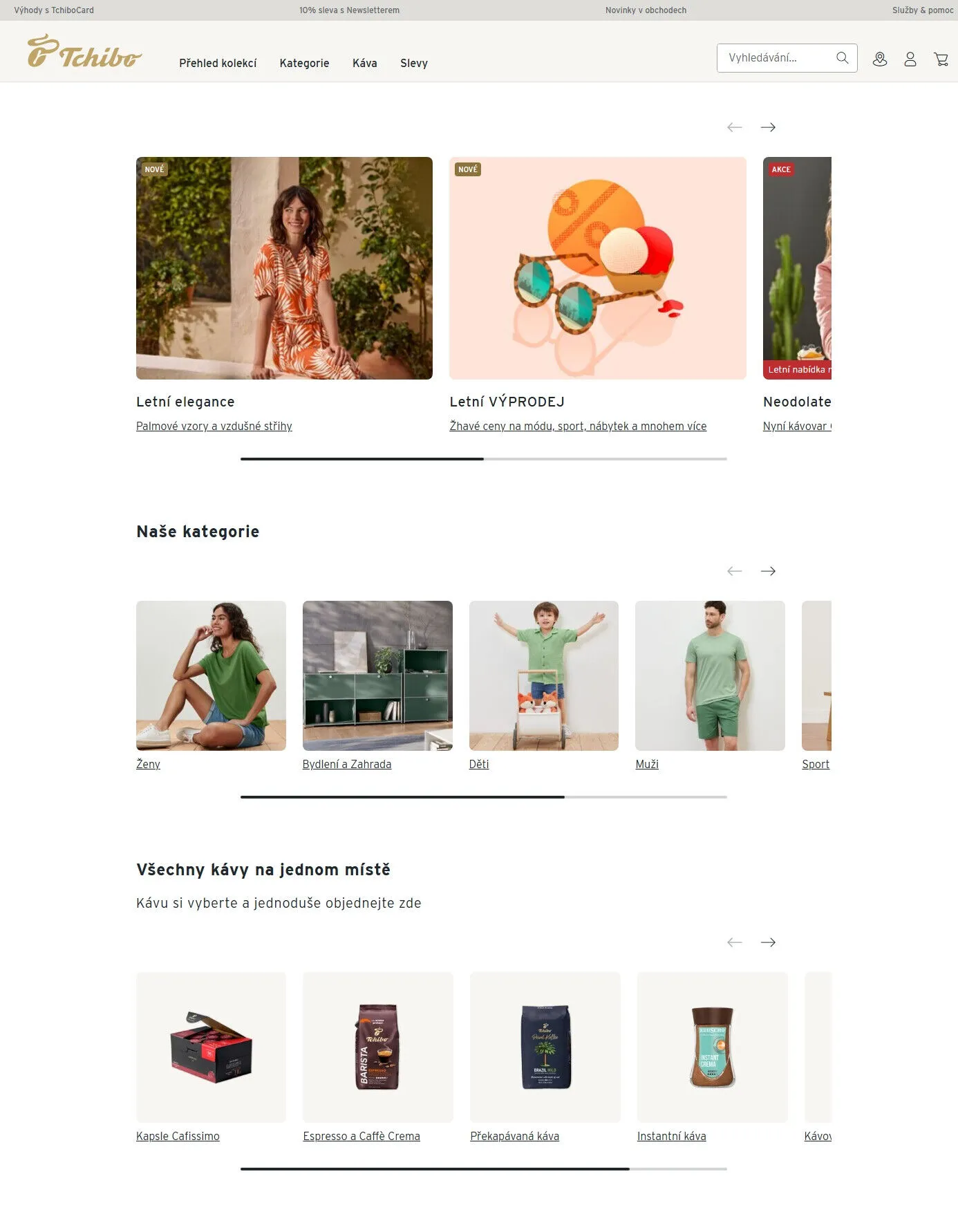 Pro milovníky kávy máme vše na jednom místě – od kapslí Cafissimo po překapávanou a instantní kávu. Vyberte si svou oblíbenou kávu a jednoduše objednejte. Neodolejte naší letní nabídce a objevte také kategorie pro ženy, muže a děti, stejně jako inspiraci pro bydlení a zahradu.