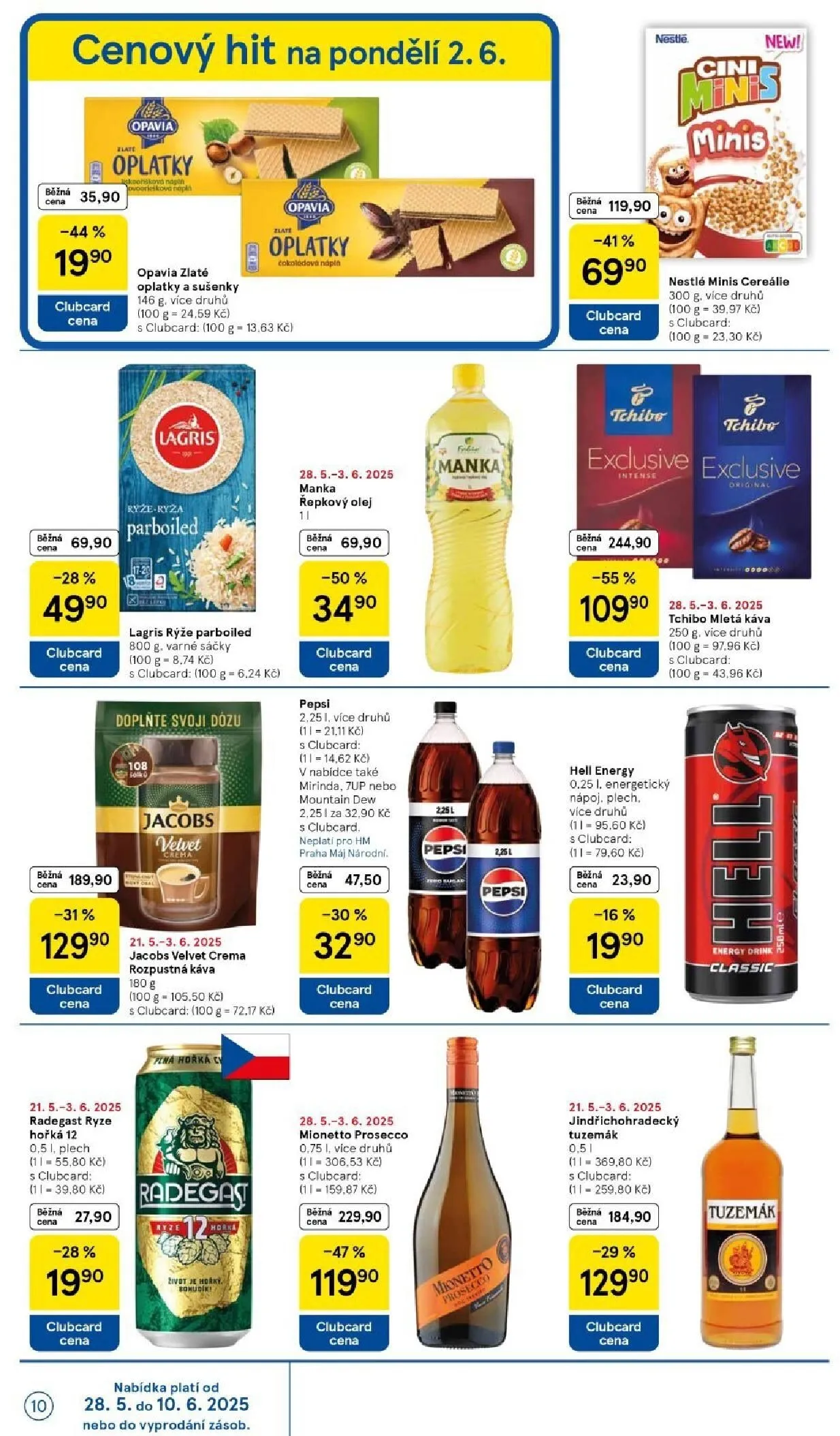 V letáku obchodu Tesco najdete skvělé cenové hity na pondělí 2.6. Mezi nimi jsou například Opavia zlaté oplatky a sušenky za 35,90 Kč, což představuje slevu 41 %. Dále si můžete pořídit Nestlé minis cereálie 300 g za 19,90 Kč, což je o 44 % levnější s Clubcard.