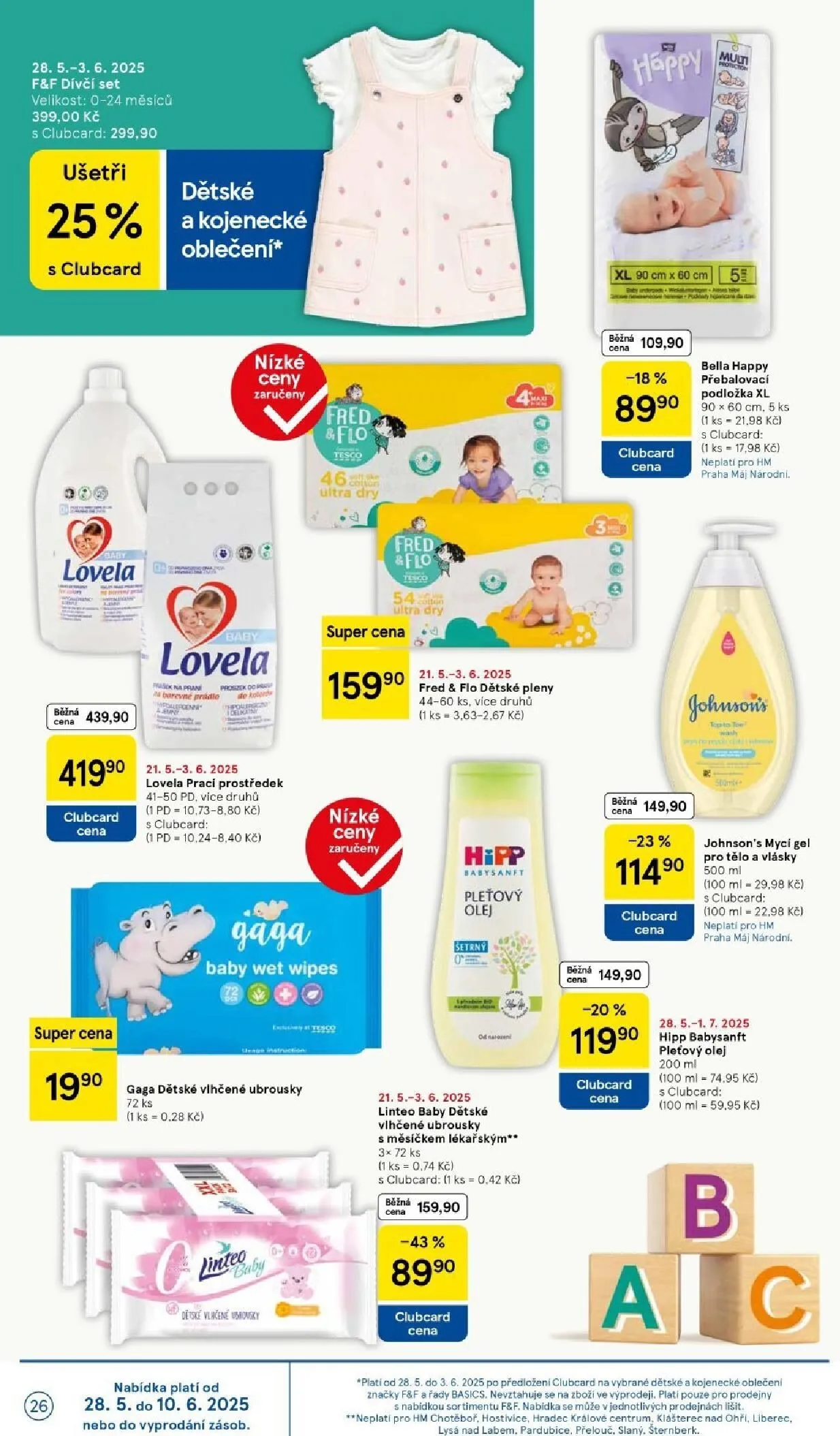 Dále jsou v akci dětské pleny Fred & Flo za 419,90 Kč s Clubcard. Lovela nabízí prací prostředek a další produkty za nízké ceny.
