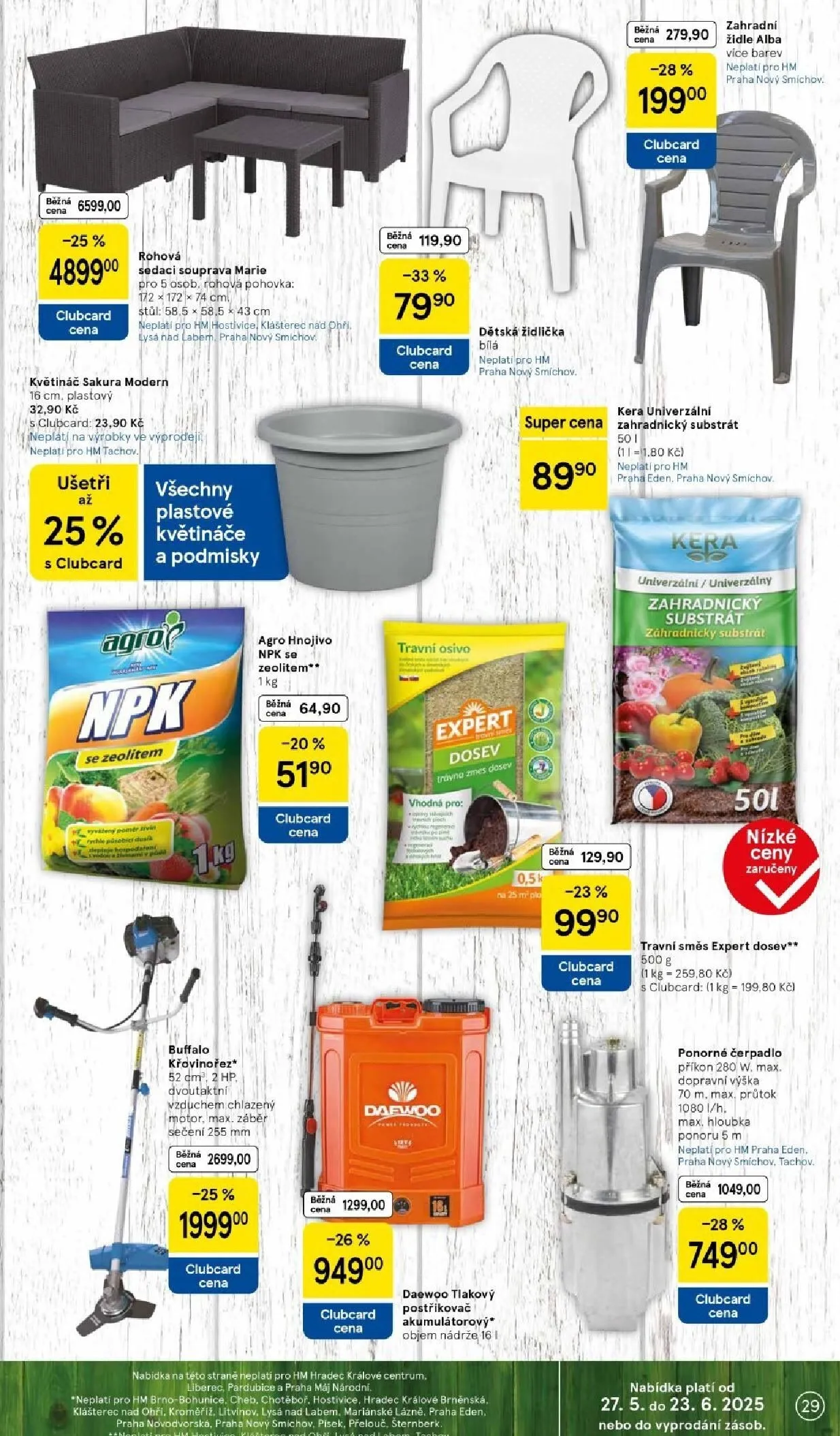V letáku obchodu Tesco najdete širokou nabídku produktů za skvělé ceny. Mezi nimi se nachází moderní židle a pohovky v různých barvách, které jsou nyní se slevou až 25 %. Dětská židlička v bílé barvě je k dispozici za 79,90 Kč. Pro zahrádkáře máme zahradnický substrát a travní osivo s výraznými slevami. Nezapomeňte také na plastové květináče a podmisky, které můžete zakoupit se slevou 25 % s Clubcard. V nabídce najdete i akumulátorový postřikovač a ponorné čerpadlo za výhodné ceny. Akce platí do vyprodání zásob, tak neváhejte a navštivte nás!