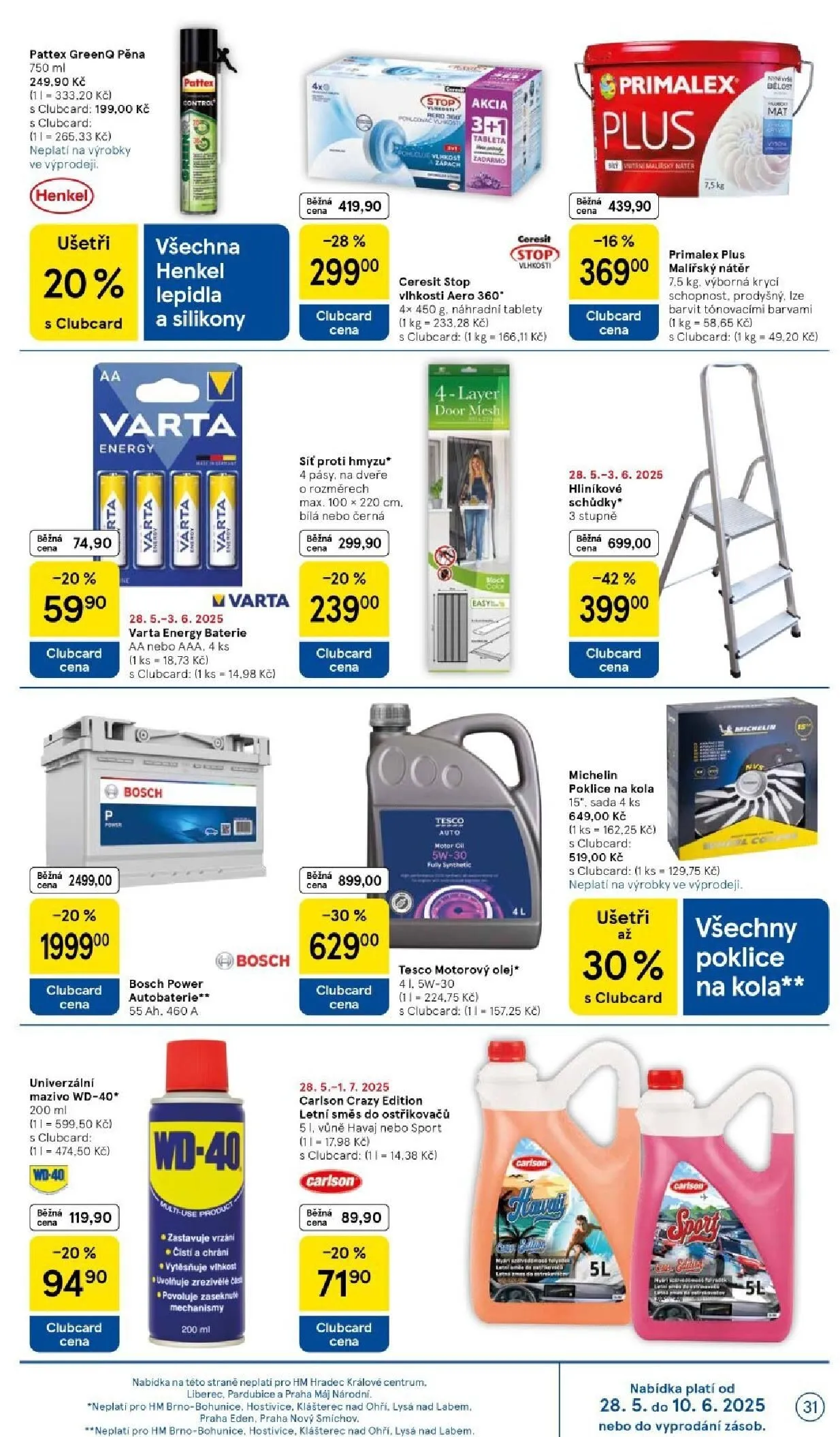V letáku obchodu Tesco najdete širokou nabídku produktů za skvělé ceny. Například pěna Fattex Greena je nyní za 249,90 Kč, s Clubcard dokonce za 199,00 Kč. Ušetřit můžete také na lepidlech a silikonech značky Henkel.
