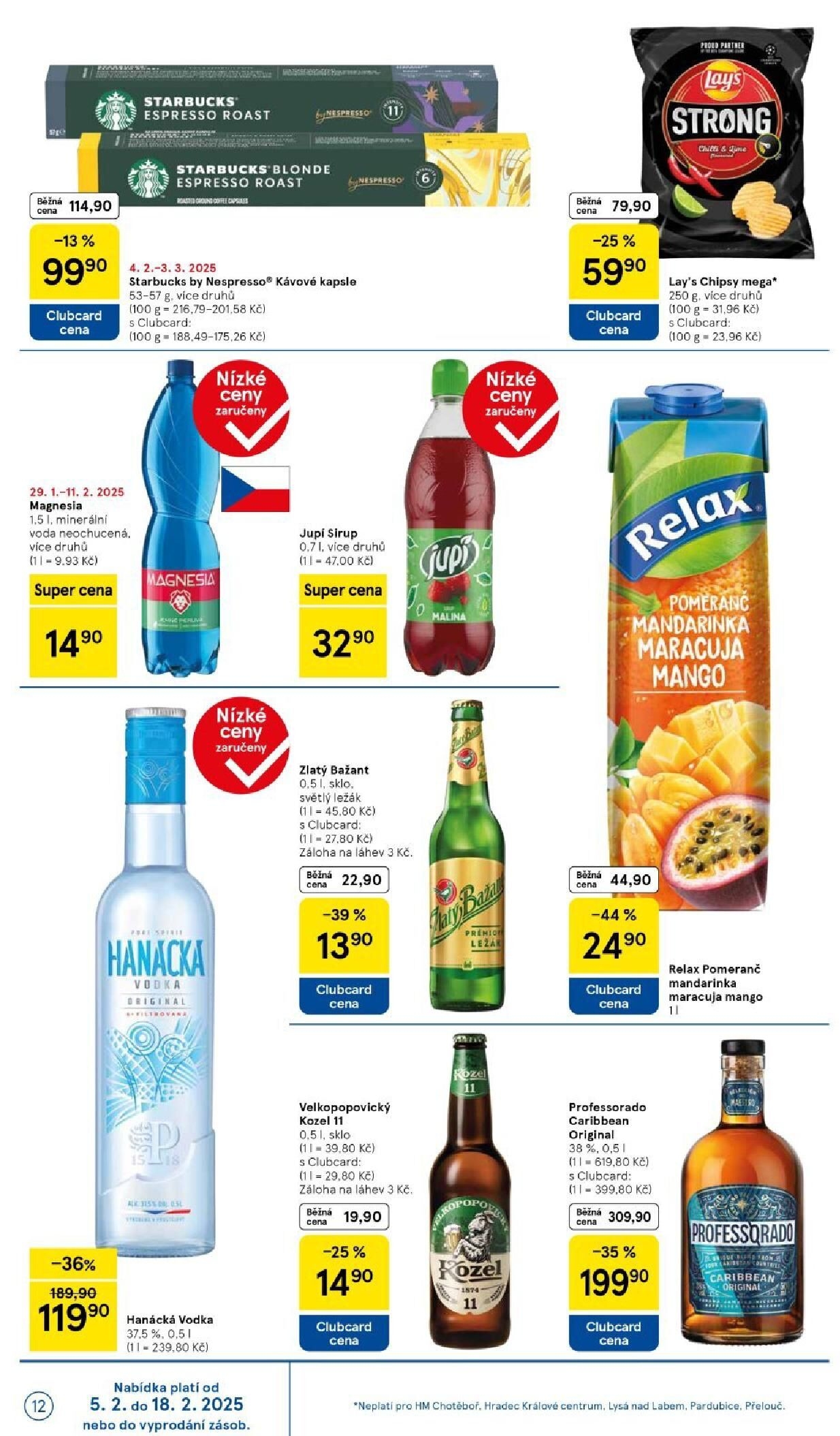 V letáku obchodu Tesco najdete širokou nabídku produktů za skvělé ceny. Mezi nimi jsou kávové kapsle Starbucks, které jsou nyní za cenu 79,90 Kč s Clubcard. Dále si můžete vychutnat Lay's chipsy mega za 29,90 Kč, nebo minerální vodu Magnesia za 14,90 Kč.