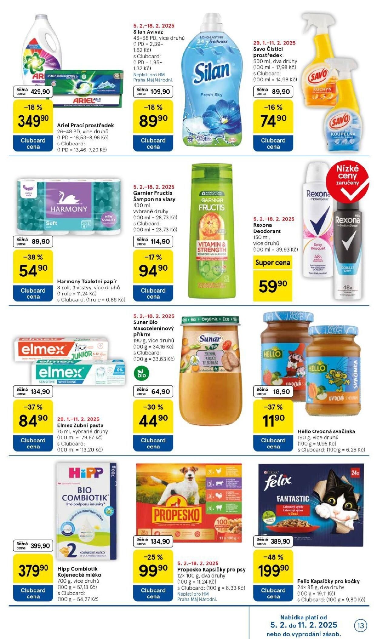 V letáku obchodu Tesco najdete širokou nabídku produktů za skvělé ceny. Například prací prostředek Ariel je nyní za 349,90 Kč s Clubcard, což je sleva 18 %. Toaletní papír Harmony, 8 rolí, je k dostání za 89,90 Kč, což představuje úsporu 38 %.