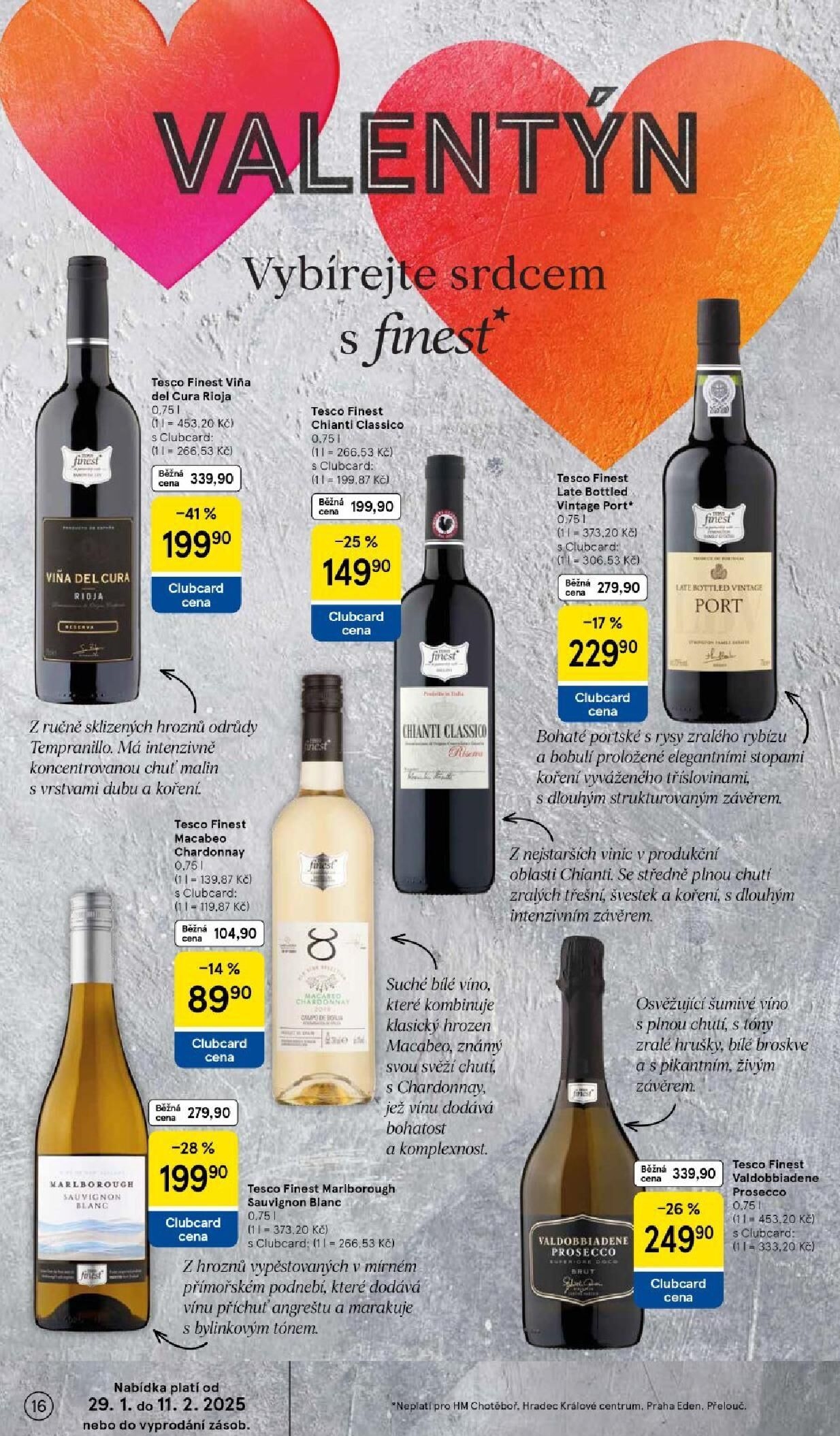 V letáku obchodu Tesco najdete širokou nabídku kvalitních vín, která potěší každého milovníka. Mezi nimi se nachází Tesco Finest Vina Del Cura Rioja, které je vyrobeno z ručně sklizených hroznů odrůdy tempranillo. Toto víno má intenzivně koncentrovanou chuť malin s nádechem dubu a koření.