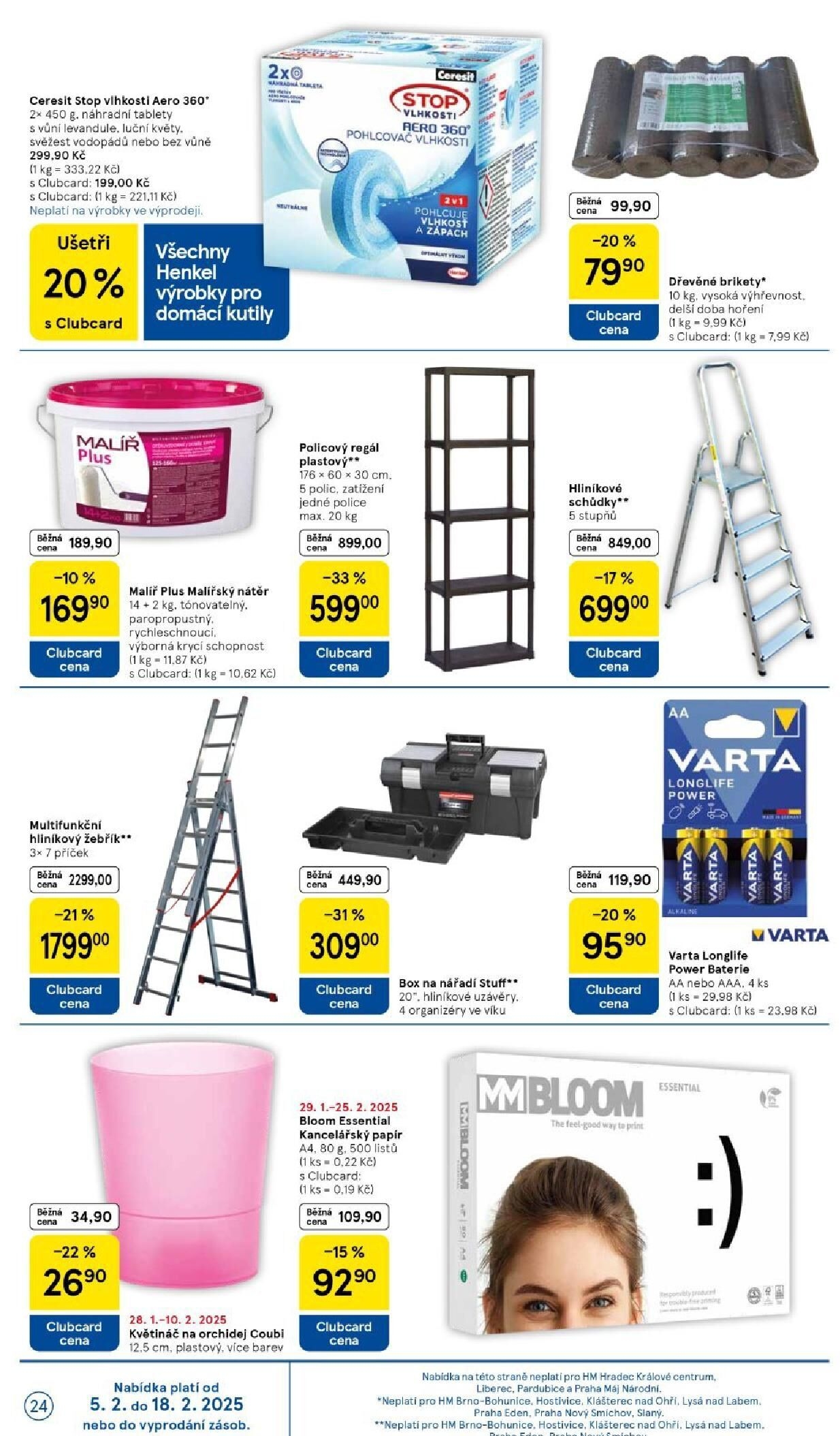 V letáku obchodu Tesco najdete širokou nabídku produktů pro domácnost a kutily. Například pohlcovač vlhkosti Ceresit Stop s náhradními tablety v levandulové vůni za 299,90 Kč (s Clubcard 199,00 Kč). Dále multifunkční malířský nátěr 14 kg za 189,90 Kč (s Clubcard 169,90 Kč).