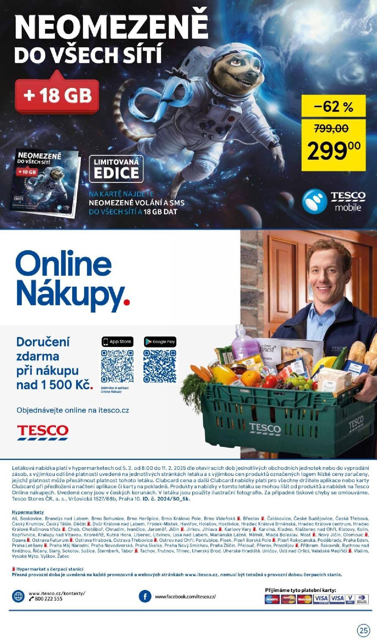 V letáku obchodu Tesco najdete skvělé nabídky na mobilní služby. Nabízíme neomezené volání a SMS do všech sítí, spolu s 18 GB dat za skvělou cenu 299 Kč. Tato limitovaná edice je dostupná na kartě a platí v hypermarketech od 5. do 11. února 2025.