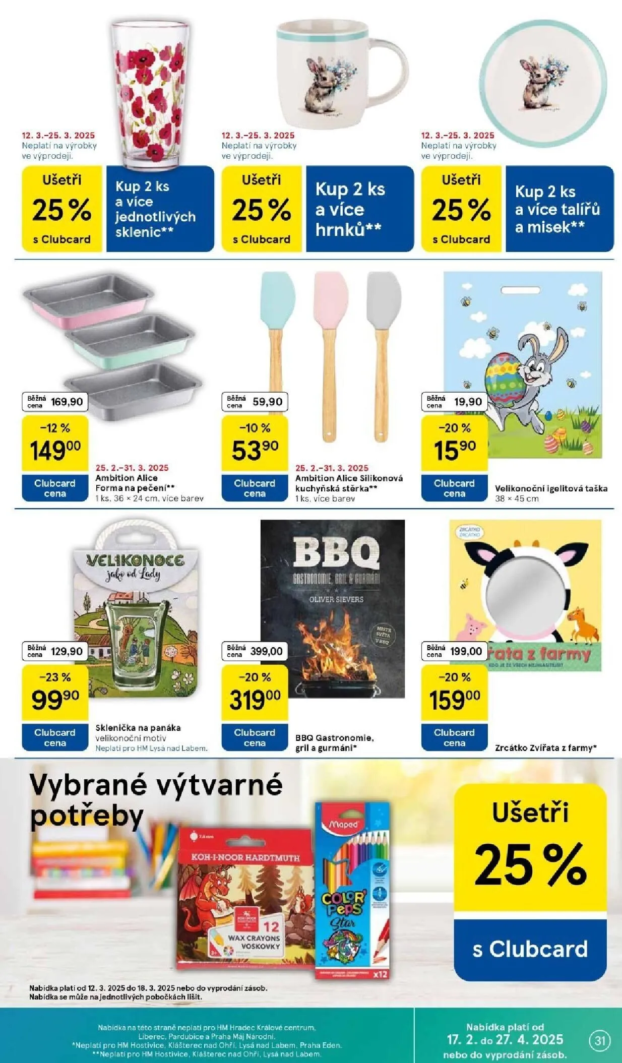 V letáku obchodu Tesco najdete skvělé nabídky od 12. 3. do 25. 3. 2025. Ušetřete 25 % s clubcard na vybrané produkty, jako jsou sklenice a talíře, pokud zakoupíte 2 ks a více. Mezi dalšími nabídkami se objevuje forma na pečení za 99,90 Kč a sklenička na panáka s velikonočním motivem za 53,90 Kč. Nezapomeňte také na silikonovou kuchyňskou stěrku a gril pro gurmány. V nabídce najdete i velikonoční igelitovou tašku a zrcátko se zvířaty z farmy. Akce platí do vyprodání zásob, tak neváhejte!