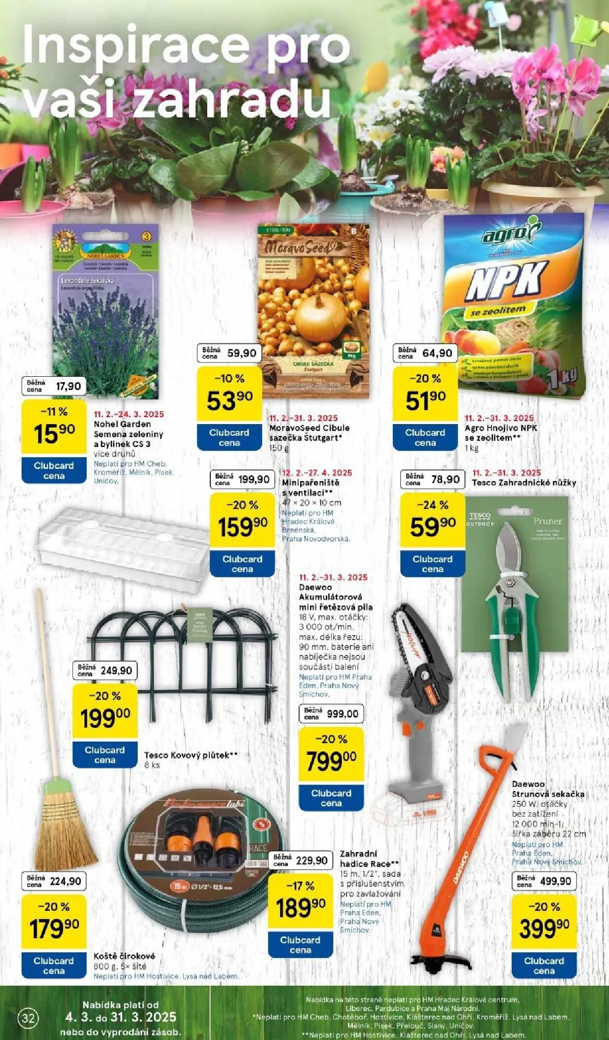 V letáku obchodu Tesco najdete širokou nabídku produktů pro vaši zahradu. Mezi nimi se nachází sazečka cibule Moravoseed za 59,90 Kč, mini pařeniště s ventilací za 199,90 Kč a agro hnojivo NPK za 17,90 Kč. Nezapomeňte také na zahradnické nůžky Tesco za 78,90 Kč a kovový plůtek za 199,00 Kč. Pro milovníky zahradní techniky je k dispozici akumulátorová mini řetězová pila Daewoo za 799,00 Kč a strunová sekačka za 399,90 Kč. Všechny ceny platí do 31. 3. 2025 nebo do vyprodání zásob. Nezapomeňte využít Clubcard pro další slevy!