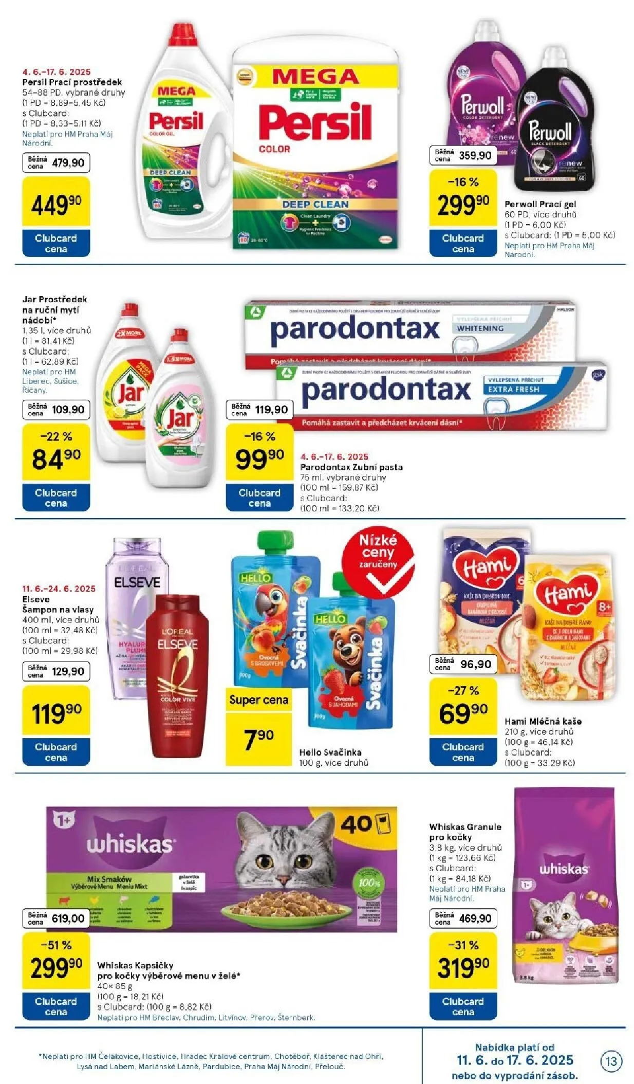 V letáku obchodu Tesco na období od 4. 6. do 17. 6. 2025 najdete širokou nabídku produktů za výhodné ceny. Mezi nimi je prací prostředek Persil, který je k dispozici za cenu 449,90 Kč s Clubcard. Dále je v akci Jar prostředek na ruční mytí nádobí za 109,90 Kč.