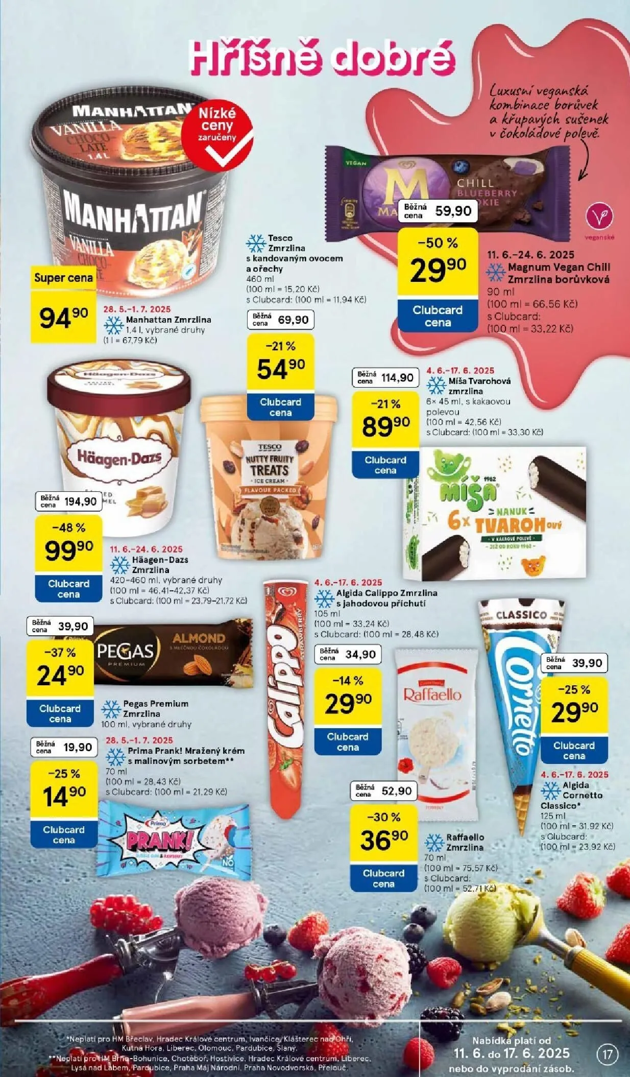 V letáku obchodu Tesco najdete širokou nabídku zmrzlin a mražených dezertů za skvělé ceny. Například Manhattan zmrzlina s kandovaným ovocem a oříšky je k dispozici za 15,20 Kč za 100 ml, s Clubcard dokonce za 11,94 Kč.