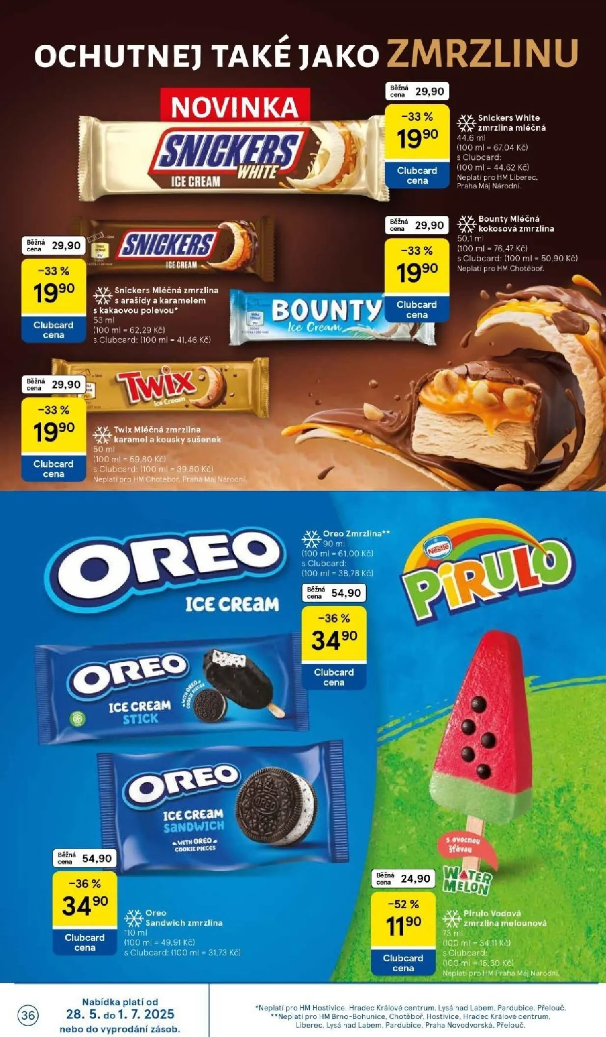 V letáku obchodu Tesco najdete skvělou nabídku zmrzlin, které si můžete vychutnat v horkých letních dnech. Mezi novinkami se objevují mléčné zmrzliny Snickers, Bounty a Twix, všechny za cenu 29,90 Kč s 33% slevou. Pro milovníky Oreo je k dispozici zmrzlina s touto oblíbenou příchutí za 54,90 Kč. Nezapomeňte také na Snickers White a kokosovou zmrzlinu Bounty, které jsou nyní za výhodné ceny. Nabídka platí do 1. července 2025 nebo do vyprodání zásob. Využijte Clubcard a získejte ještě lepší ceny!