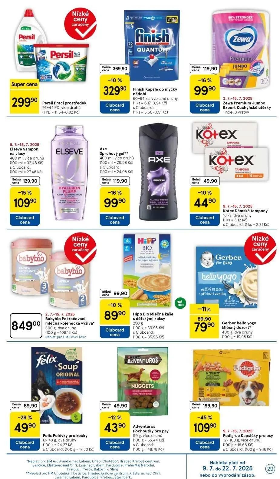 V letáku obchodu Tesco najdete širokou nabídku produktů za nízké ceny, které jsou zaručeny. Mezi nimi se nachází prací prostředek Persil, Finish kapsle do myčky, sprchový gel Axe a šampon Elseve. Nezapomeňte také na Zewa premium utěrky a dámské tampony Kotex. Pro naše nejmenší nabízíme mléčnou kojeneckou výživu Babybio a bio mléčnou kaši Hipp. Pro domácí mazlíčky máme Felix polévky pro kočky a kapsičky Pedigree pro psy. Využijte výhodné ceny s Clubcard a nakupujte chytře! Akce platí od 9. 7. do 22. 7. 2025 nebo do vyprodání zásob.