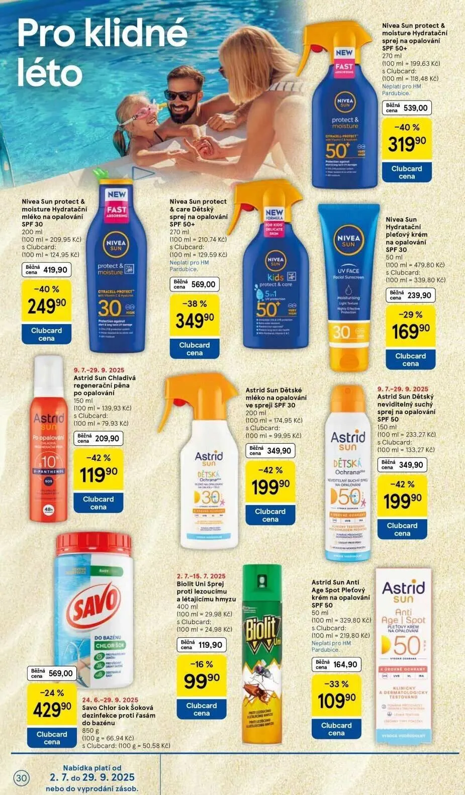 V letáku obchodu Tesco najdete širokou nabídku produktů pro klidné léto. Mezi nimi je hydratační mléko na opalování Nivea Sun & Moisture SPF 30, které je nyní za skvělou cenu 249,90 Kč s Clubcard. Dále nabízíme chladivou regenerační pěnu po opalování Astrid Sun za 119,90 Kč s Clubcard. Pro děti máme dětský sprej na opalování Nivea Sun Protect & Care SPF 50, který je k dostání za 349,90 Kč s Clubcard. Nezapomeňte také na ochranu proti hmyzu s Biolit Uni sprejem za 99,90 Kč s Clubcard. Všechny nabídky platí do vyprodání zásob, tak neváhejte a využijte skvělé ceny!
