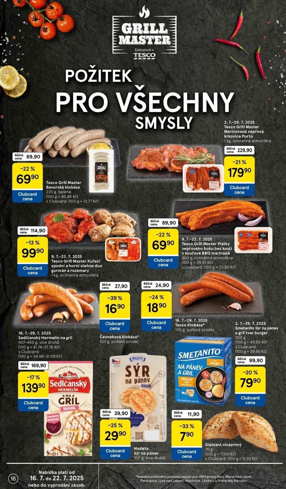 V letáku obchodu Tesco najdete skvělou nabídku produktů pro grilování, které potěší všechny vaše smysly. Mezi exkluzivními položkami se objevuje marinovaná vepřová krkovice Porto za 179,90 Kč s Clubcard, nebo bavorská klobása v balení 220 g za 69,90 Kč.