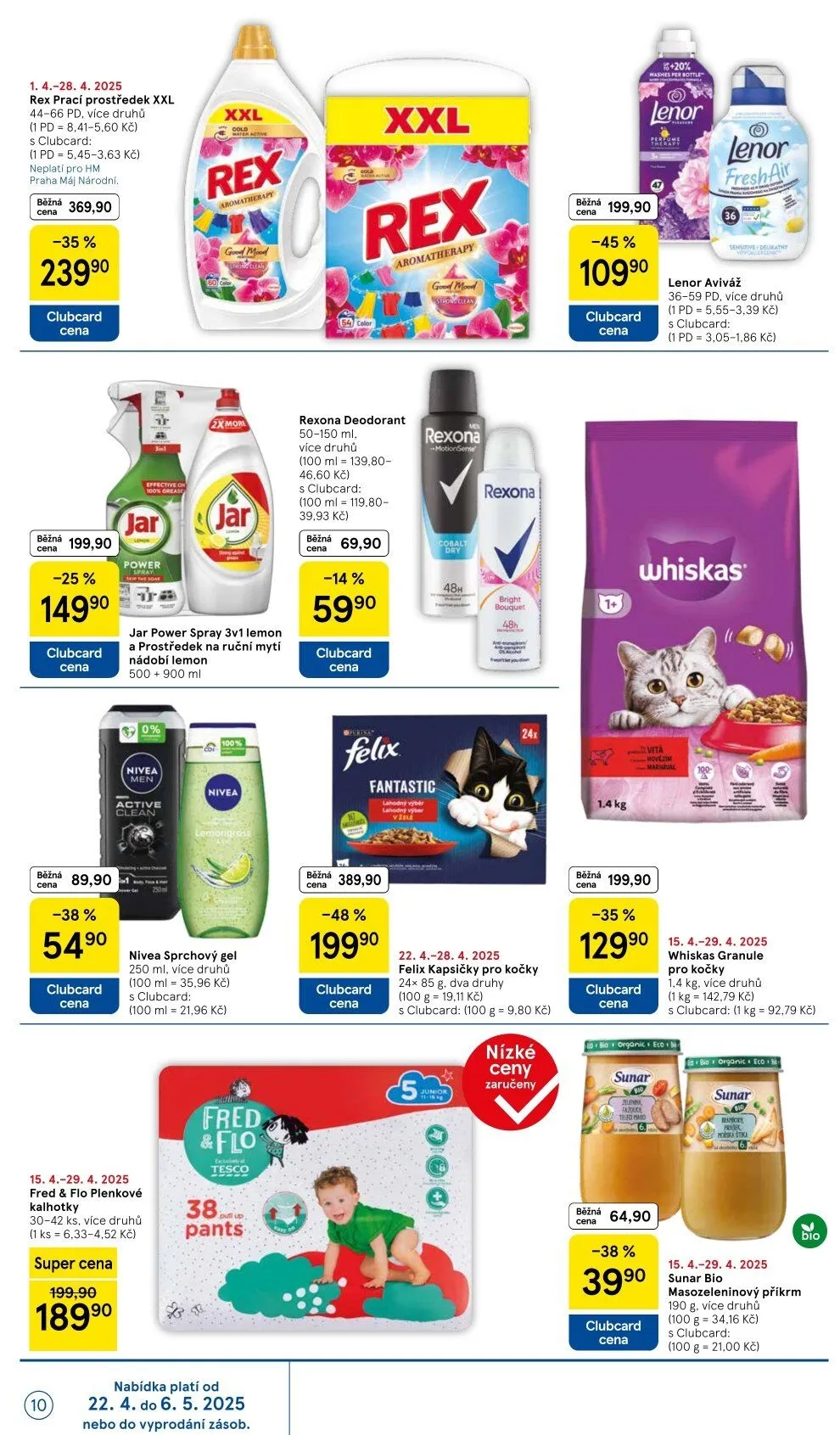 V letáku obchodu Tesco najdete širokou nabídku produktů za skvělé ceny. Mezi nimi je rex prací prostředek XXL, který nyní můžete pořídit se slevou 35 % za 239,90 Kč. Jar Power spray 3v1 a prostředek na ruční mytí nádobí lemon jsou k dispozici za 54,90 Kč s 38% slevou.