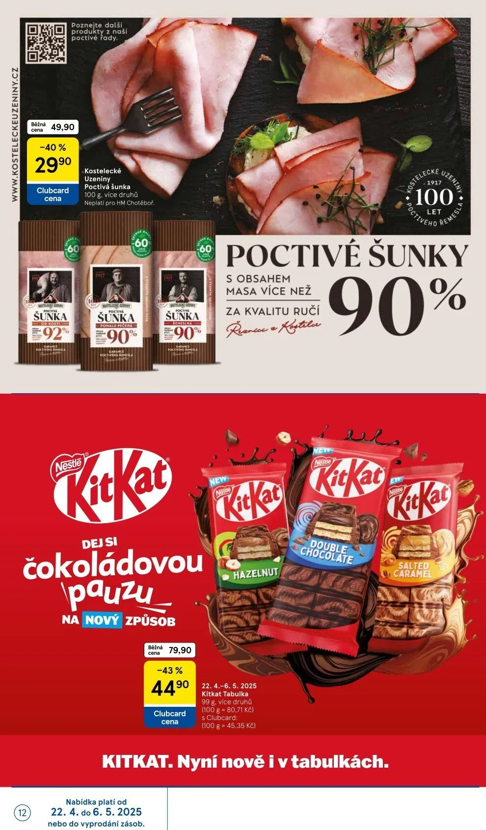 Dále nabízíme KitKat tabulku, 100 g, více druhů, běžná cena 79,90 Kč, nyní s Clubcard za 44,90 Kč (100 g = 45,35 Kč).
