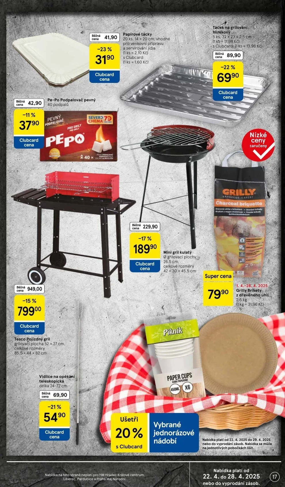 V letáku obchodu Tesco najdete skvělé nabídky na produkty pro grilování a venkovní přípravu jídla. Například pevný podpalovač za 31,90 Kč s 23% slevou, nebo papírové tácky v balení 20 ks za 14,90 Kč, které jsou ideální pro servírování pokrmů.